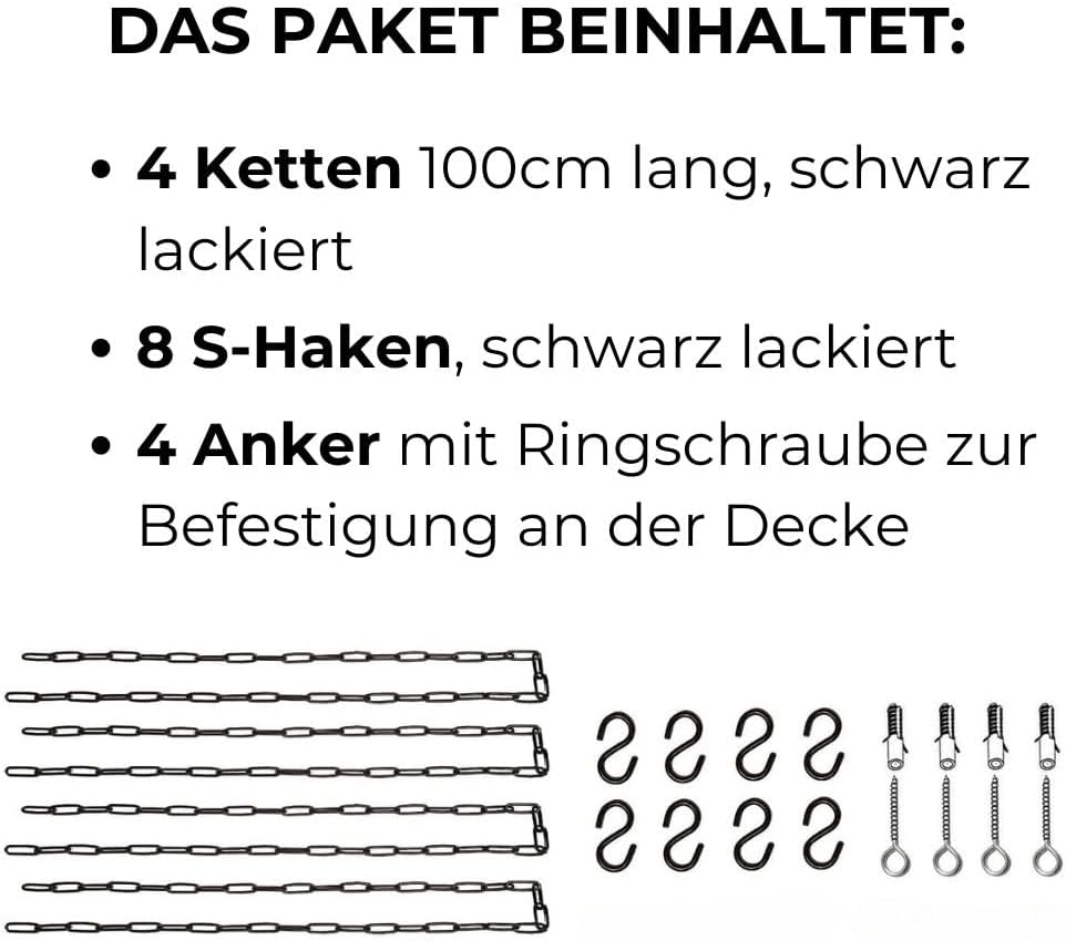 - ✅ EINFACHE MONTAGE: Eine Montageanleitung ist im Lieferumfang enthalten. Einfache Regalmontage in 5 Minuten, plus Deckenmontage. Das Paket beinhaltet: 4 x 100 cm lange Ketten und 8 x schwarz lackierte S-Haken. 4 Anker mit Ringschrauben zur Befestigung