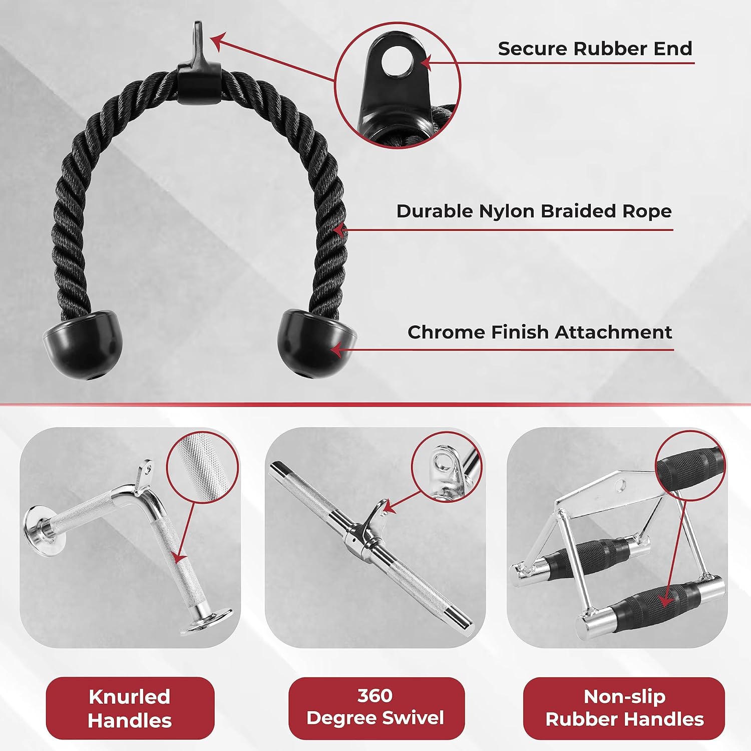 - Abmessungen: 19 x 16,5 x 14 cm Doppel-D-Row-Griff, 68,6 cm langes Trizepsseil, 16,5 cm V-Stange, 45,7 cm gerade Stange bieten Ihnen eine perfekte und bequeme Passform für Ihre Handflächen beim Training, die gut für alle Kabelgerätesysteme geeignet ist