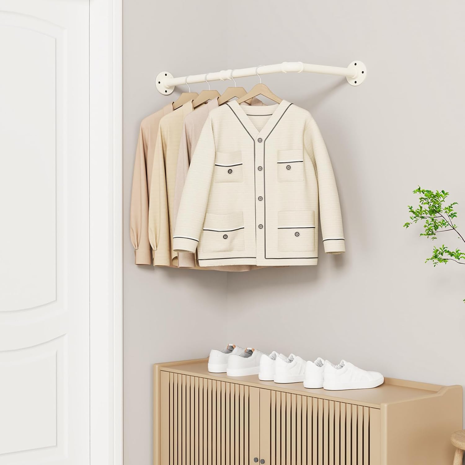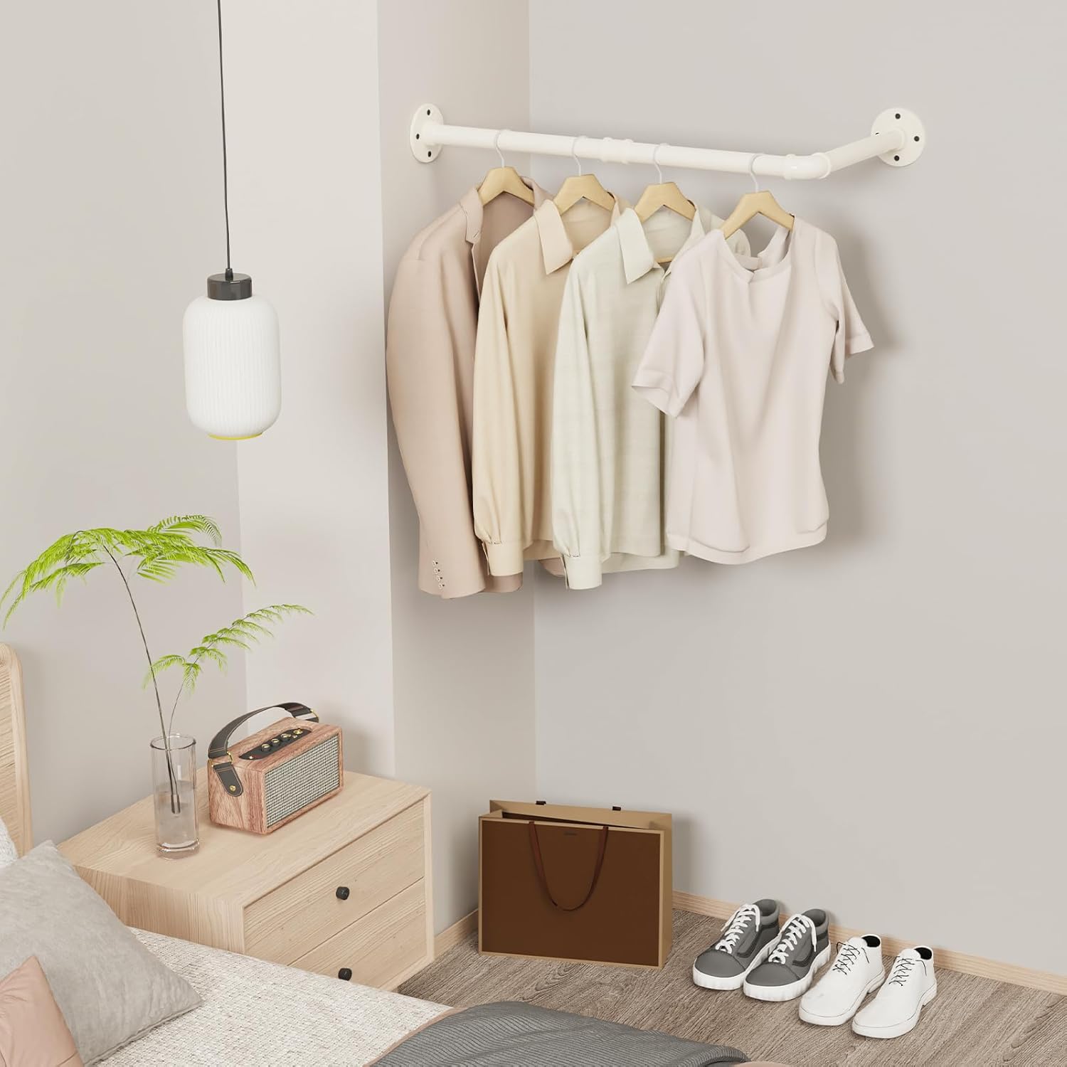 - Langlebiger Wandaufhänger: Dieser stilvoll aussehende Aufhänger besteht aus hochwertigen Eisenrohren und gewährleistet seine Festigkeit und Stabilität. Die Oberfläche des Kleiderbügels ist mit Sprühfarbe behandelt, die leicht zu reinigen ist und