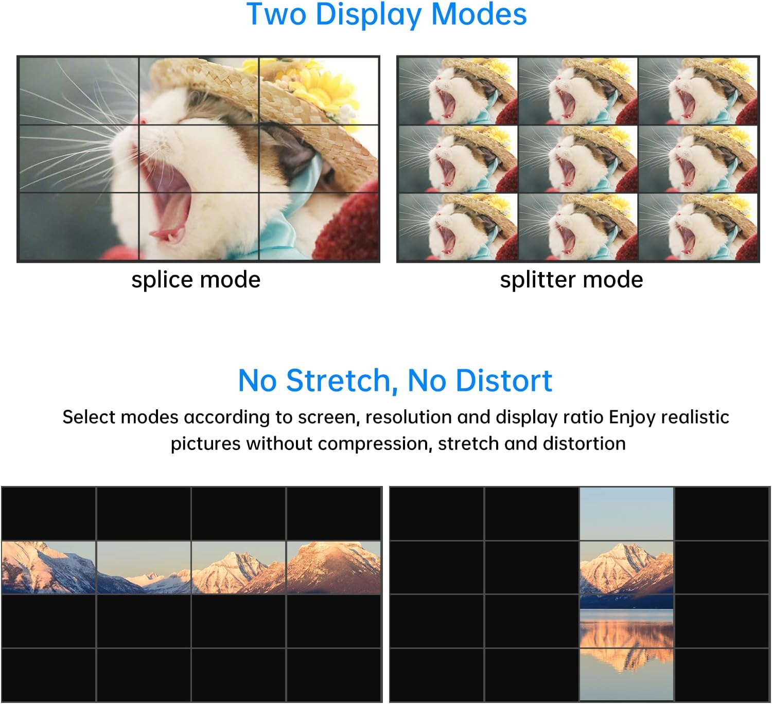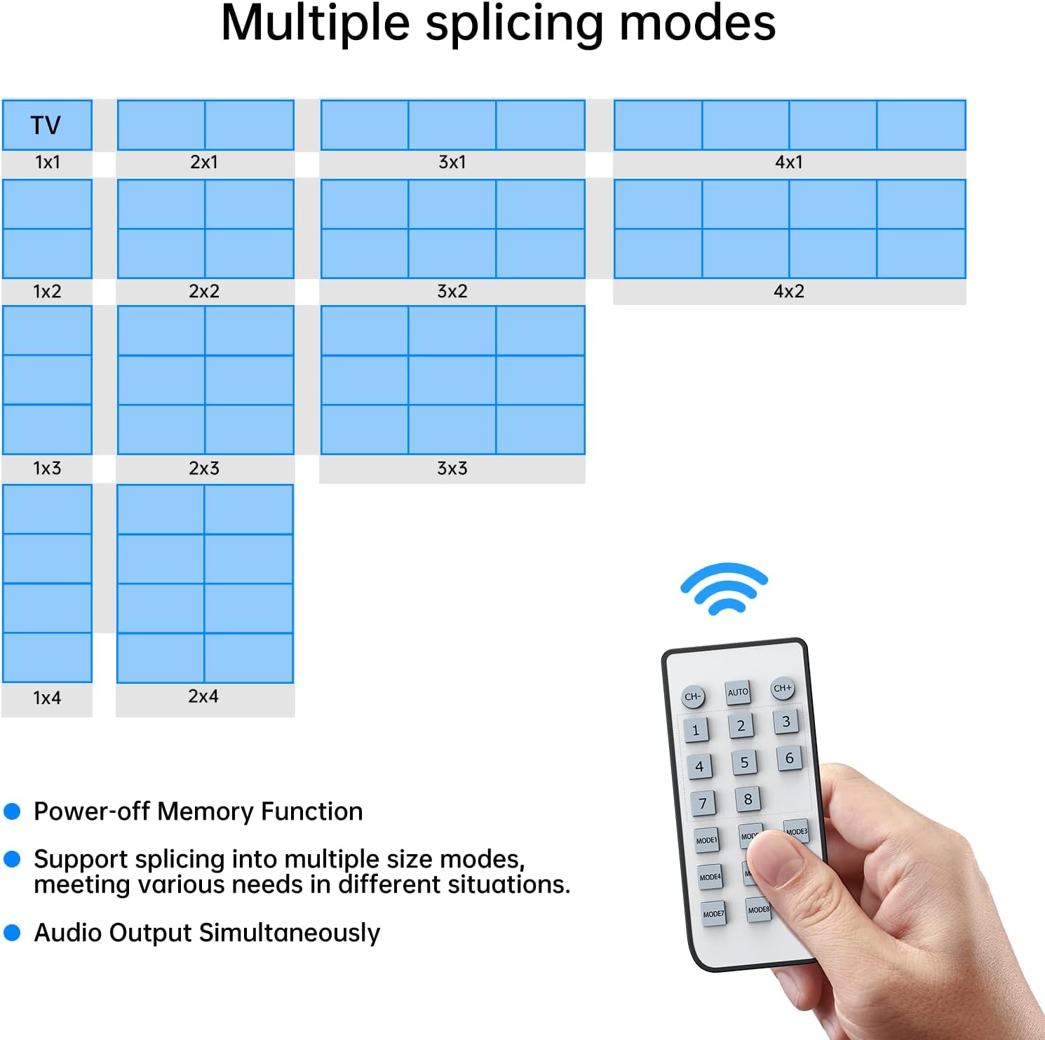 • 8 Splicing-Modi: Unterstützung mehrerer Modi zur Anzeige von 1X1,1X2,1X3,1X4,2X1,2X2,2x3, 2x4, 3x1, 3x2, 3x3,4X1, 4x2. Einfaches und praktisches Schalten über die Tasten am Bedienfeld und die IR-Fernbedienung. Ermöglicht bequemes Umschalten aus