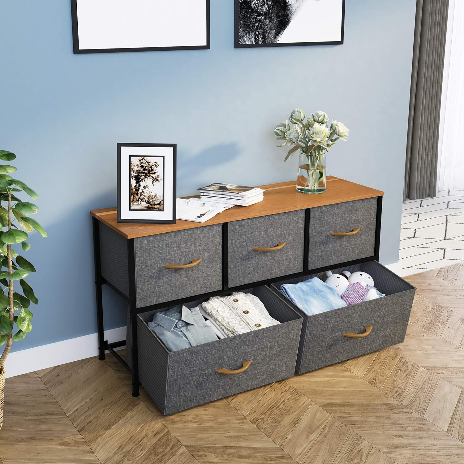 - QUALITÄTSKONSTRUKTION - YITAHOME kommode hergestellt aus zuverlässigem metallrahmen und haltbarer MDF-Holzplatte; 5 herausnehmbare und faltbare schubladen; Durch einfaches Ziehen der Holzgriffe können die schubladen bequem geöffnet und geschlossen