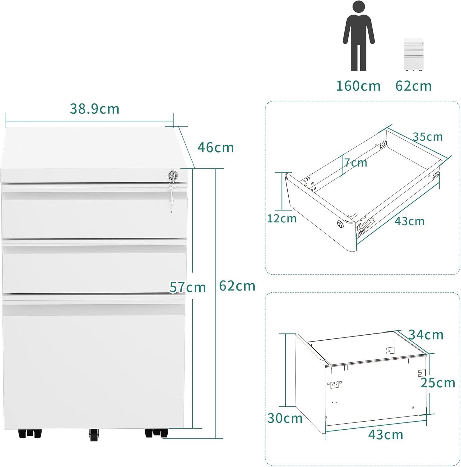 YITAHOME Mobiler Aktenschrank, Abschliessbar Rollcontainer mit 3 Schubladen für A4, Legal, Letter, M