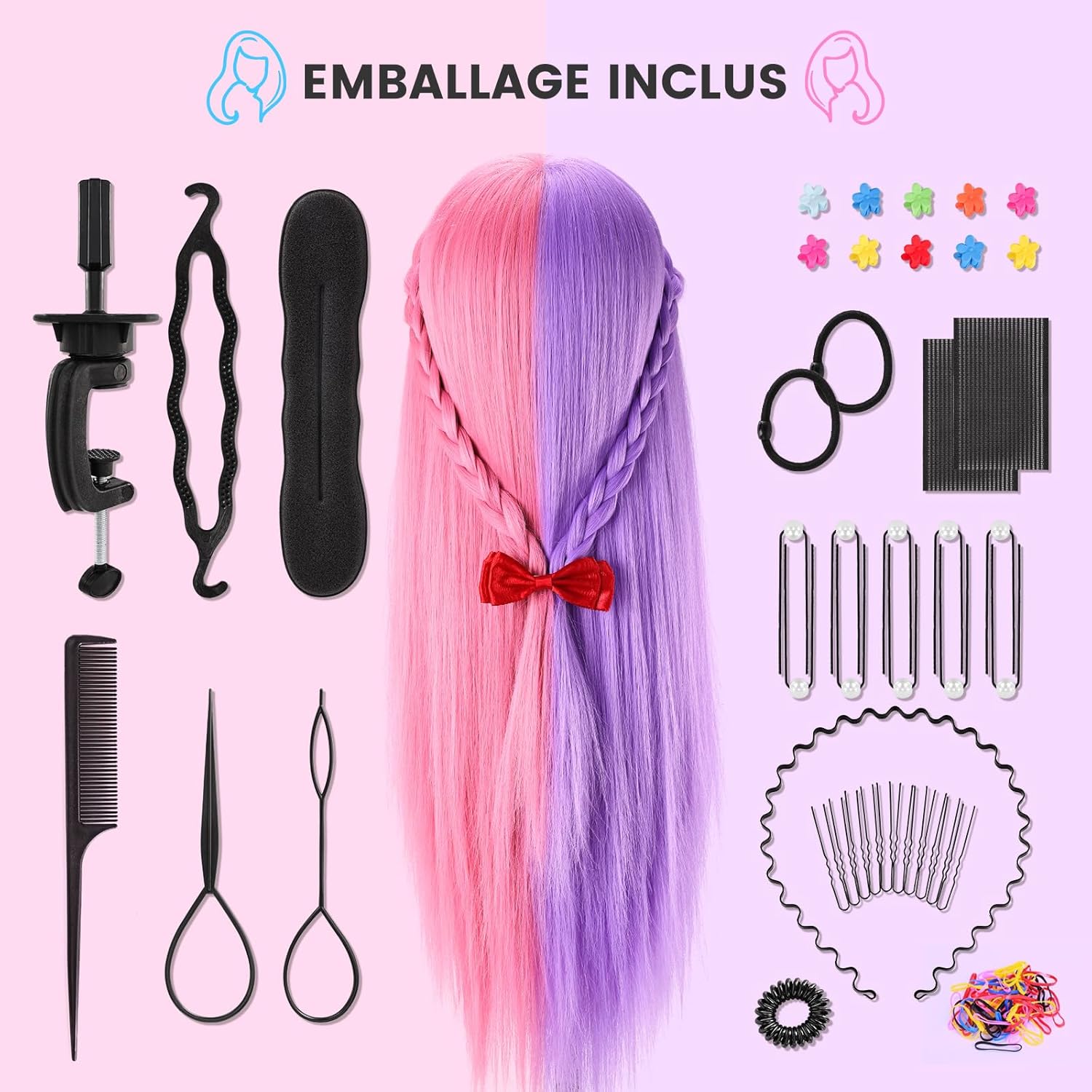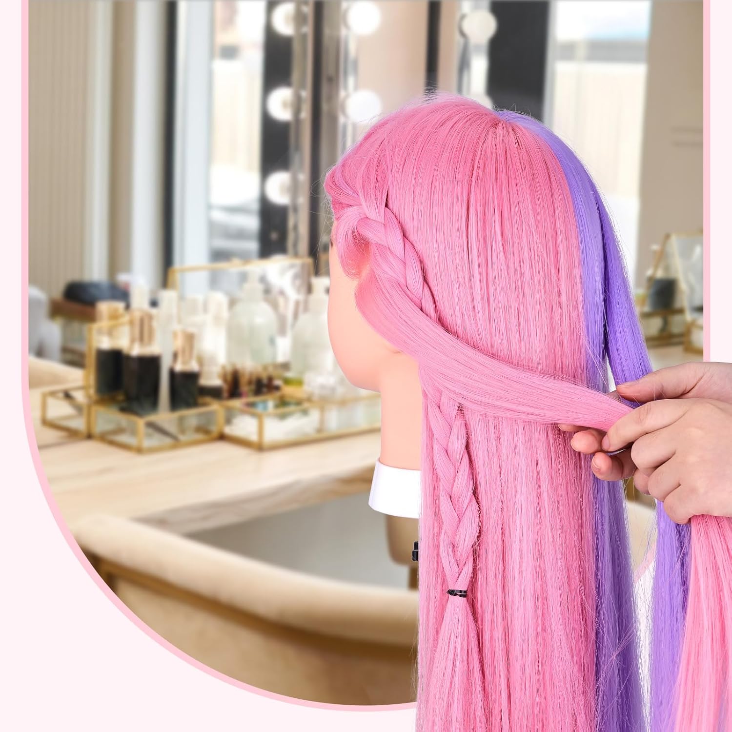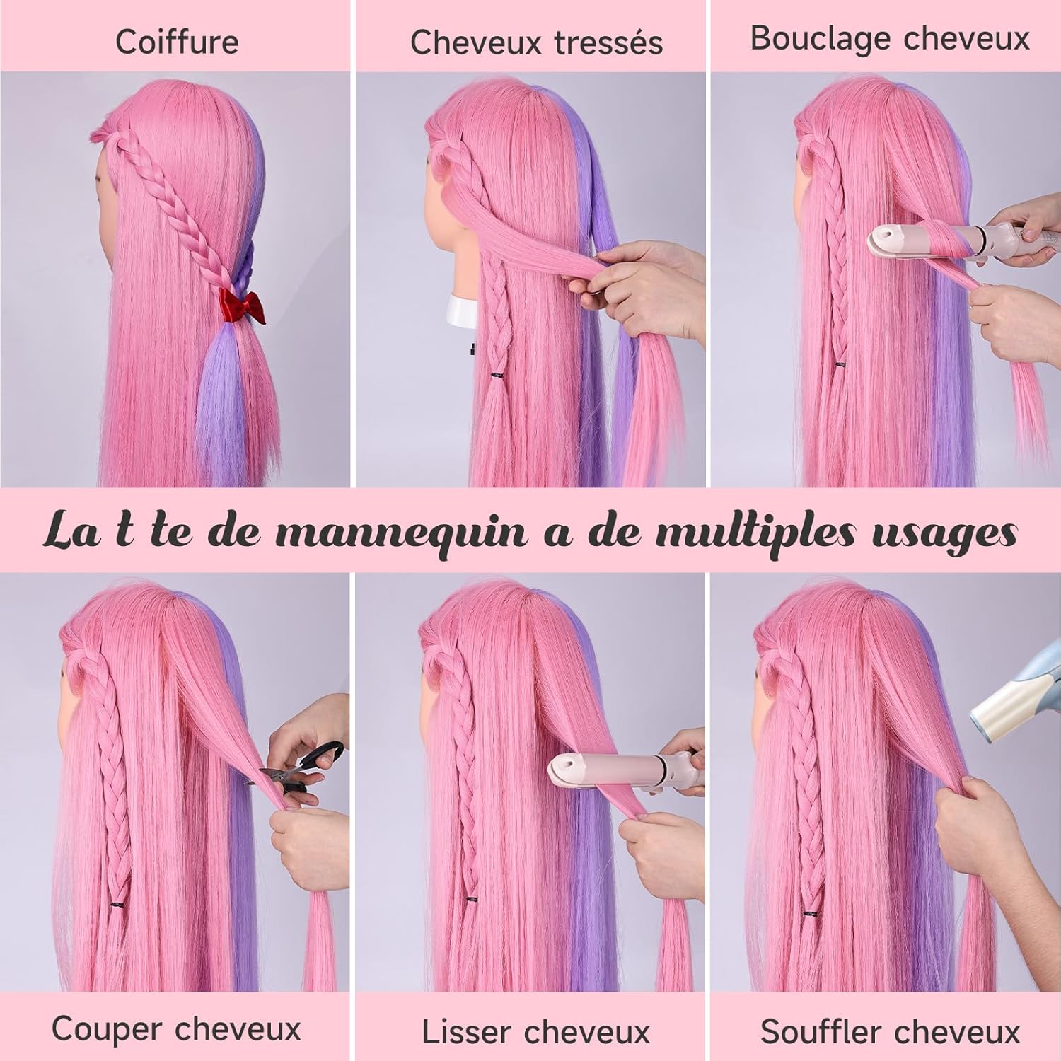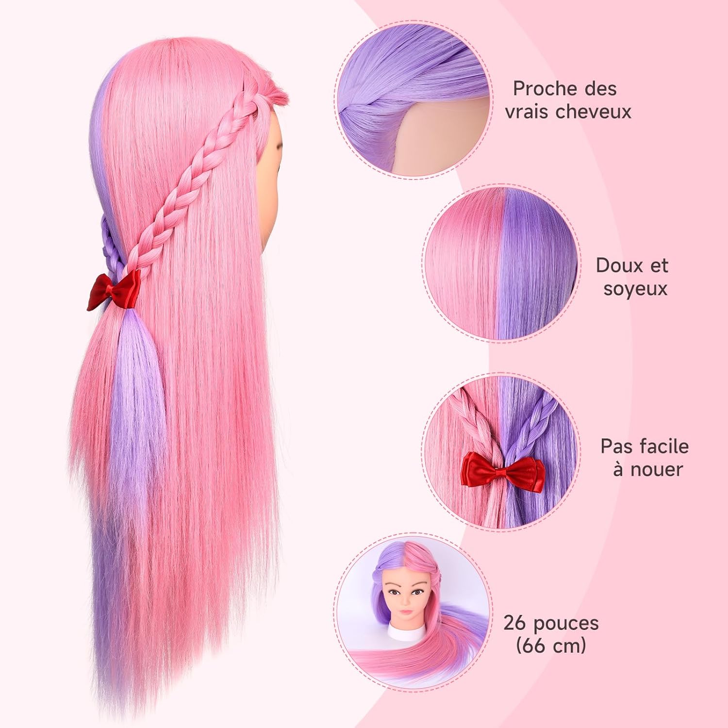 • 【Material】 Hergestellt aus 80 % Echthaar + 20 % Kunstfaserhaar, superlanges Haar, leicht zu kämmen, perfekt für verschiedene geflochtene Haarstylings. 50 % rosa und violettes Mannequin-Kopfhaar zum Schminken, Föhnen, Glätten, Dauerwelle und