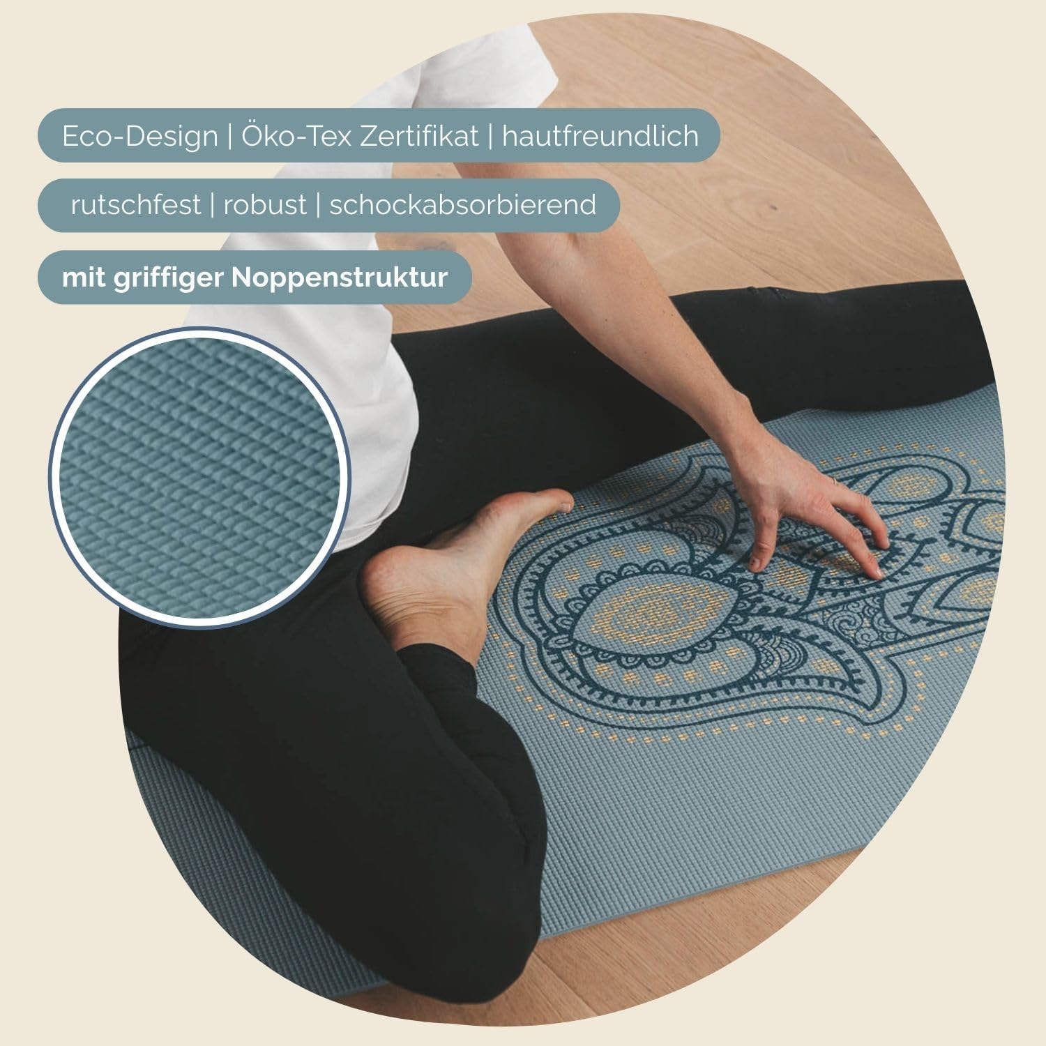 - DESIGN-PRINT: Die mit einem filigranen indischem Mandala bedruckte Matte bringt etwas Abwechslung in das Mattenmeer der Yogaklasse.