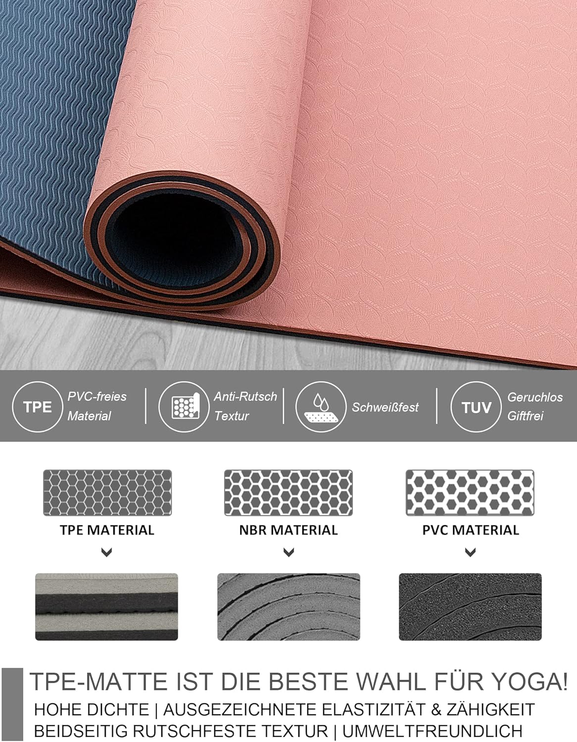 - ▨ GELENKFREUNDLICHE & VERDICKTE BAUFORM -- Die 8 mm Yoga Matte dicker bietet mehr Dämpfung und Stabilität. Sie bietet maximalen Komfort und Sicherheit für Knie, Ellenbogen und Hüften. Sie ist perfekt zum Üben von Yoga, Pilates, Gymnastik, Aerobic,