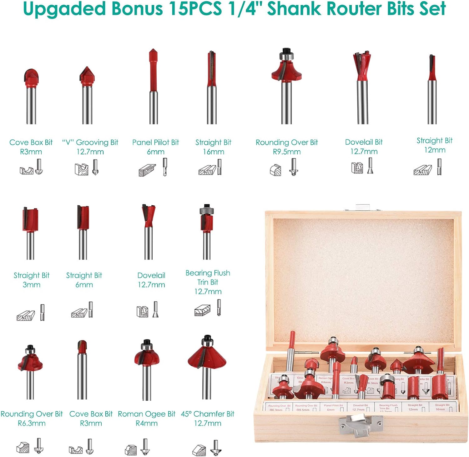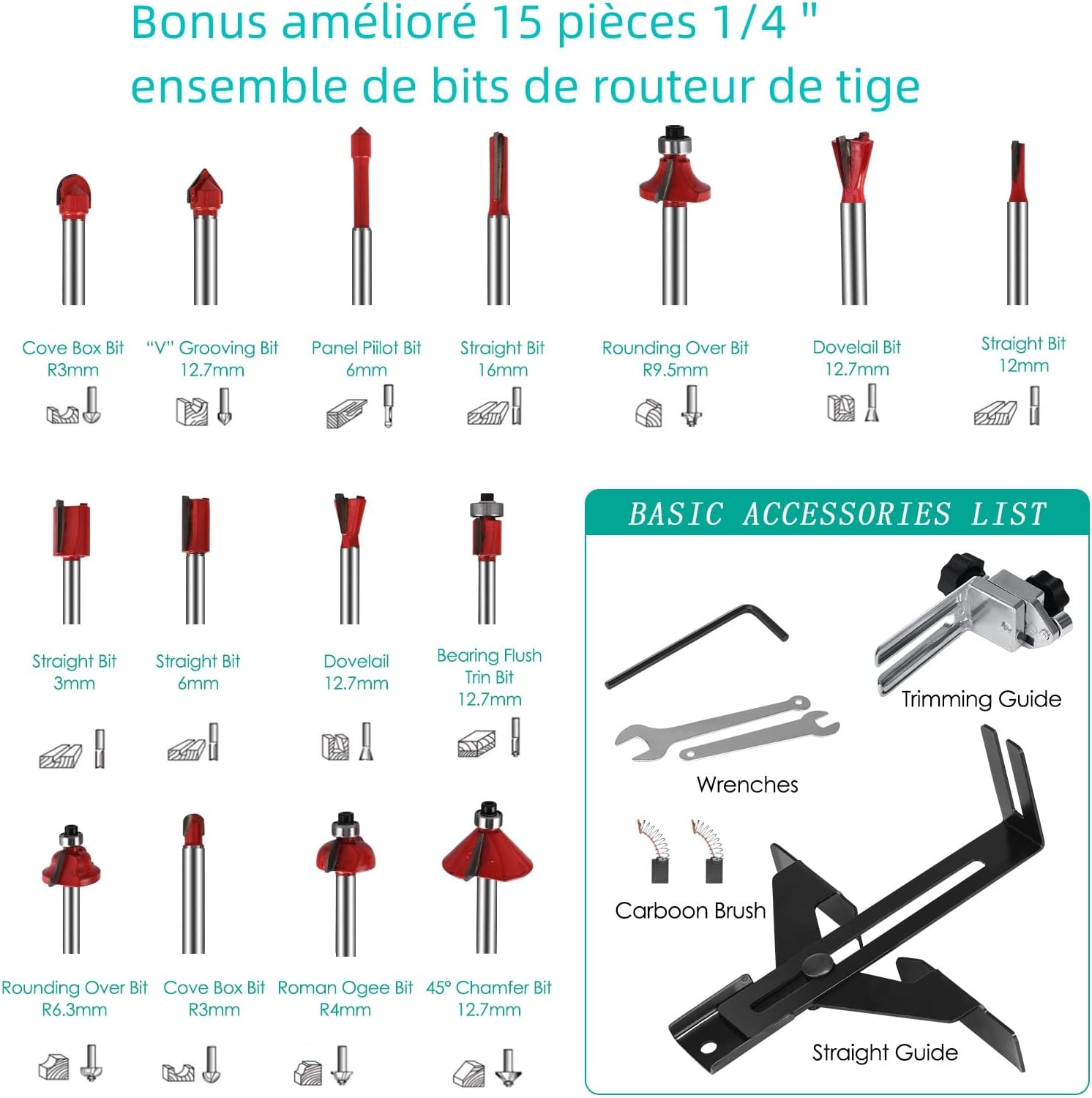 • 【Das Paket enthält】 1 x Fräsmaschine,15 x Fräser,1 x Holzkoffer,2 x Schraubenschlüssel,2 x Kohlebürste,1 x transparenter Sockel,1 x Ablenker,1 x Spannfutter; Holzfräser mit Holzaufbewahrungsbox, Multi-Cut, eine Maschine, Sie können alle Arten