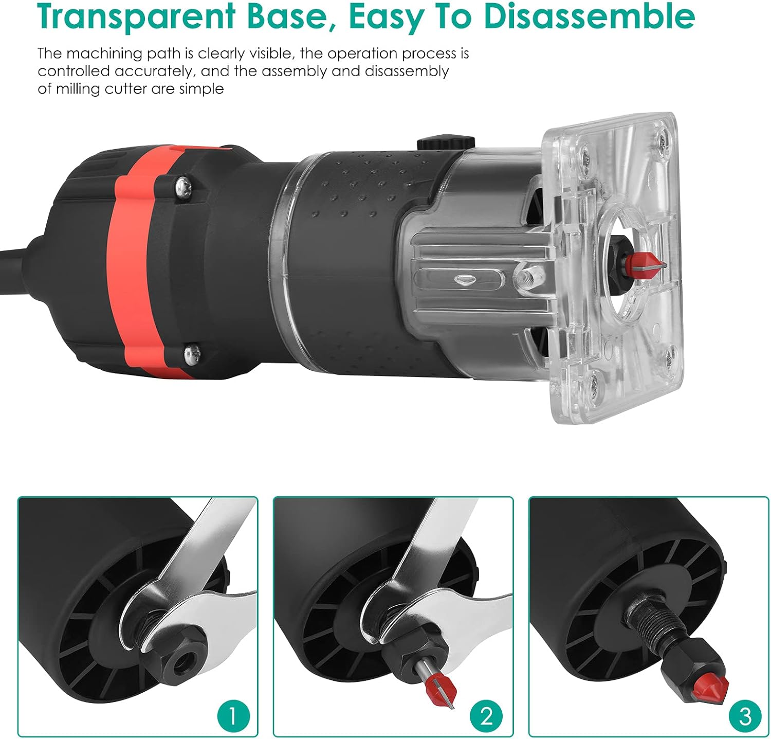 • 【Transparente Basis, präzise Steuerung】 Der Holztrimmer mit transparentem Basisdesign kann den Verarbeitungszustand klar beobachten und genau steuern. Die Waage ist gut sichtbar und einfach zu bedienen. Heben Sie den Knopf an, um die Skala