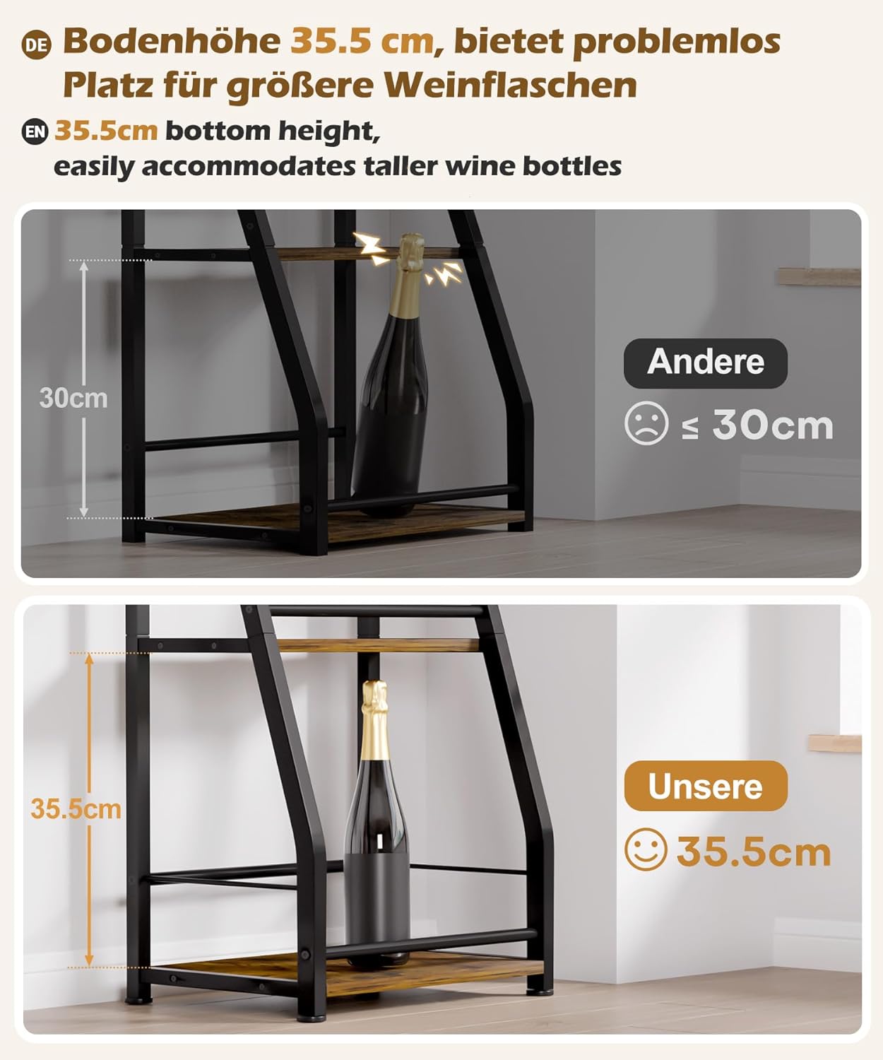 - Erhöhtes Design: Der Boden des Weinregals ist mit einer Höhe von 35,5 cm erhöht, sodass Ihre grossen Weinflaschen besser gelagert und untergebracht werden können. Egal, ob es sich um eine Weinflasche mit langem Hals oder eine grosse Champagnerflasche