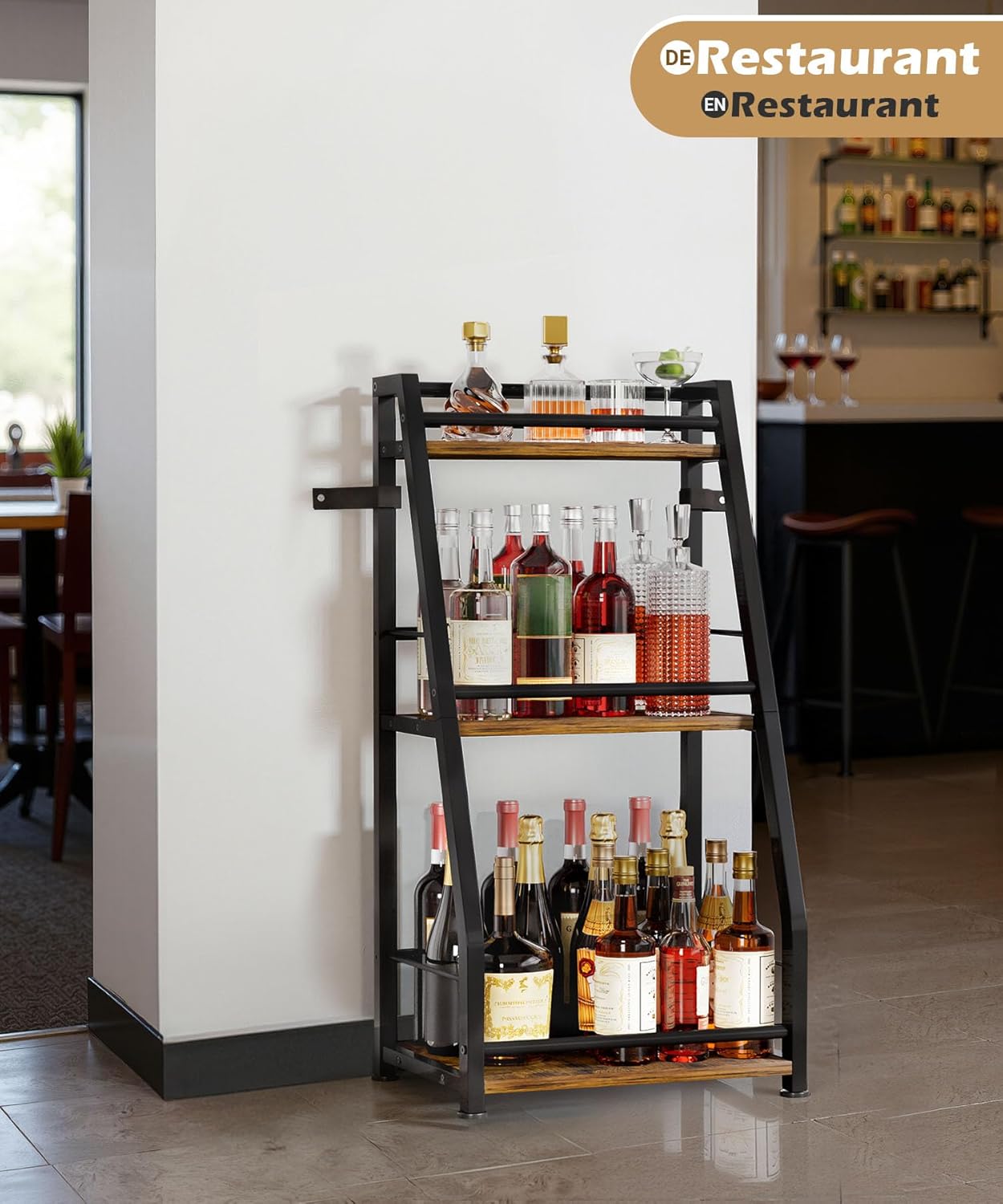 - Dreistufiges Weinregal: Das Weinregal verfügt über ein dreistufiges Leiterdesign, in dem Weinflaschen aufbewahrt werden können, ohne sich gegenseitig zu blockieren, und das bequem zugänglich ist. Es kann Wein, Whisky und Weingläser usw. aufbewahren