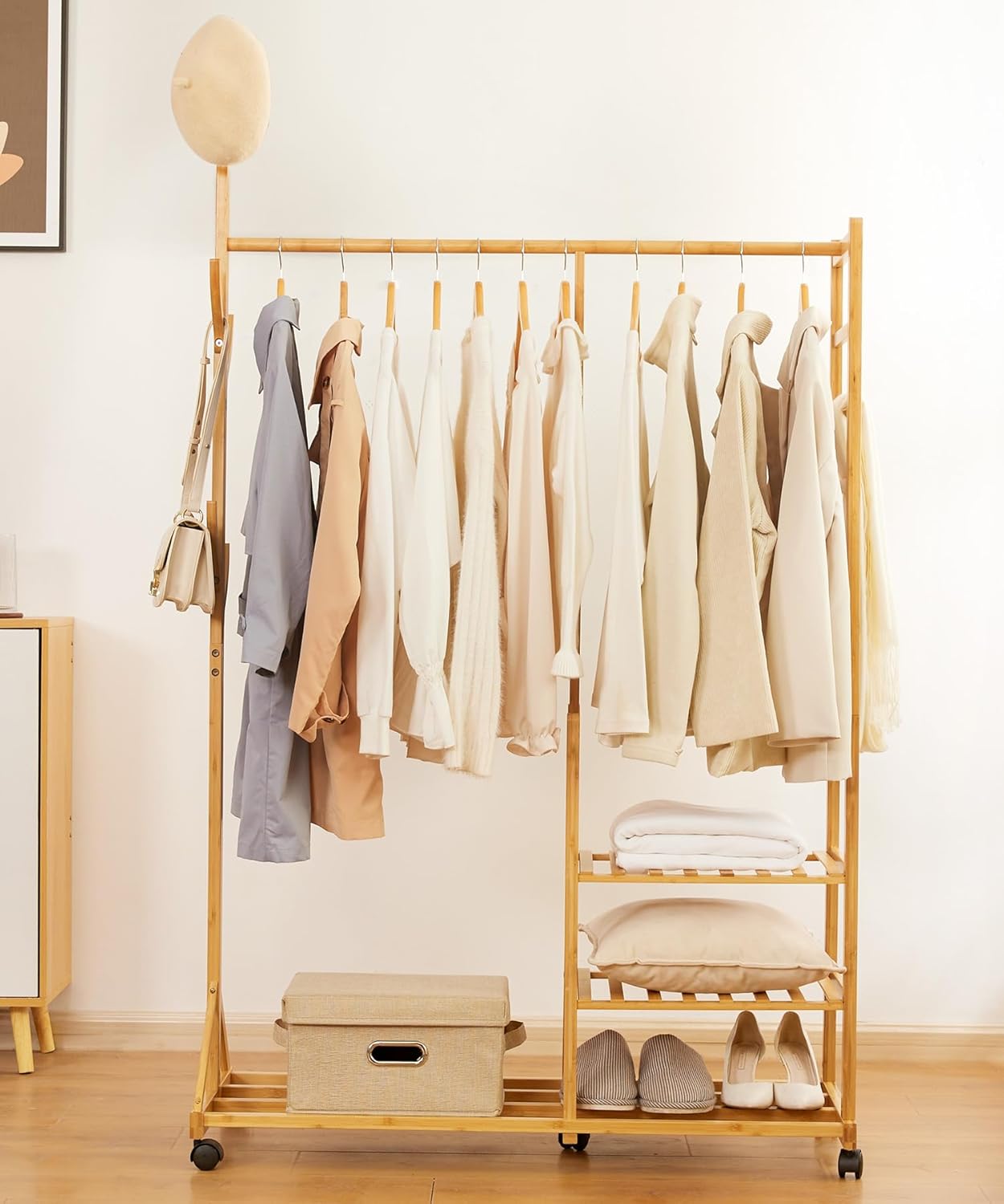 - 【5 Universalräder für eine leichte Bewegung】 Das Design mit den 5 Rädern sorgt für einen sichereren Stand. Die Räder lassen sich um 360° drehen und verfügen über eine Feststellbremse, was für einen sicheren Stand sorgt, wenn die Garderobe an einem Platz steht.
