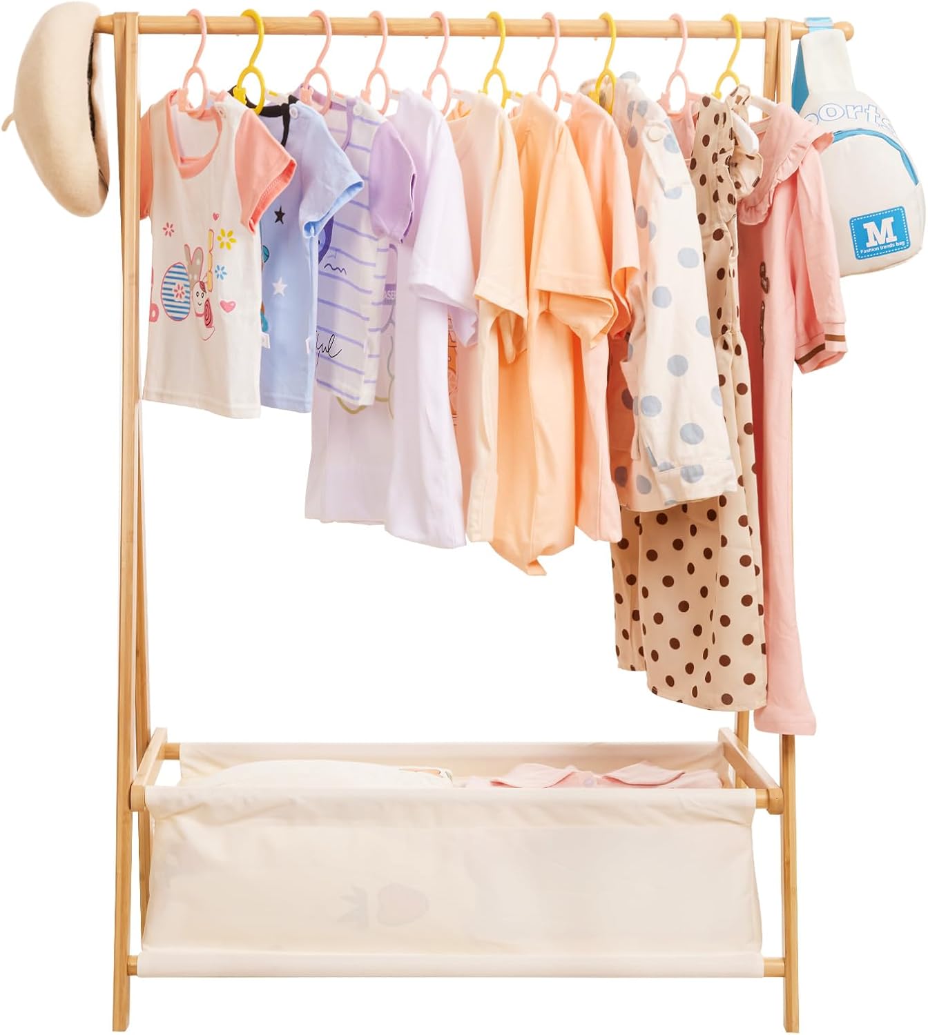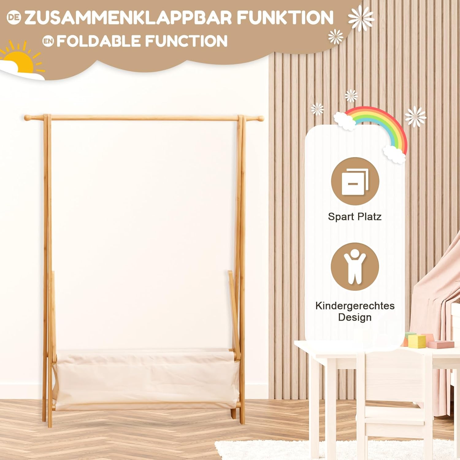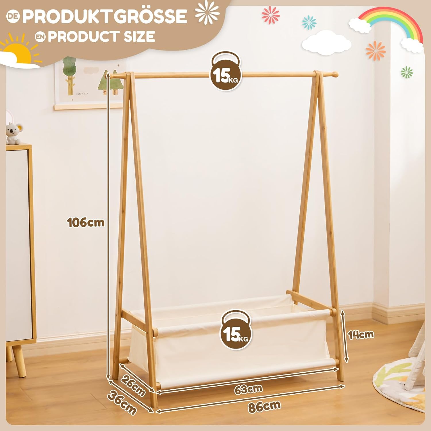 Yorbay Kinder Kleiderständer Bambus Garderobenständer mit Aufbewahrungskiste, Kindergarderobe mit Kl