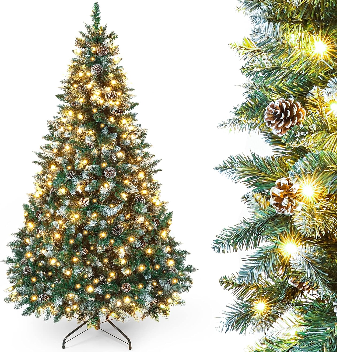 - Naturnahes Design des Weihnachtsbaums: 150 cm hoher künstlicher Weihnachtsbaum mit dichten und satt dunkelgrünen PVC Zweigen und verziert mit weissen Schneeflockenimitaten (kein einfaches Schneeflockenspray). Der Baum verfügt über insgesamt 554