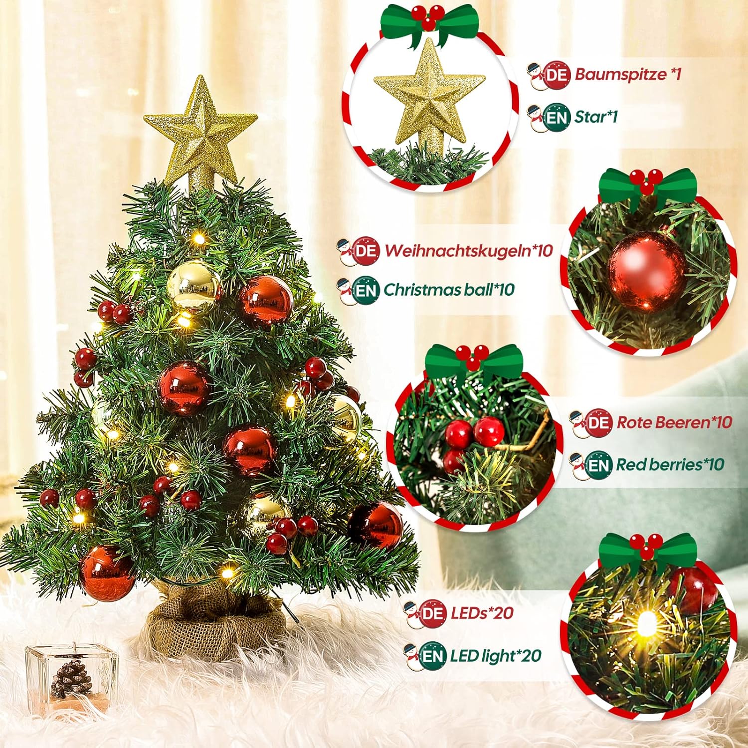 • Dekorieren Sie Ihr Haus oder Ihr Büro für die kommende Weihnachtszeit mit diesem 38cm hohen Tisch-Weihnachtsbaum mit zahlreichen Dekoelementen und stimmungsvollen Lichtern