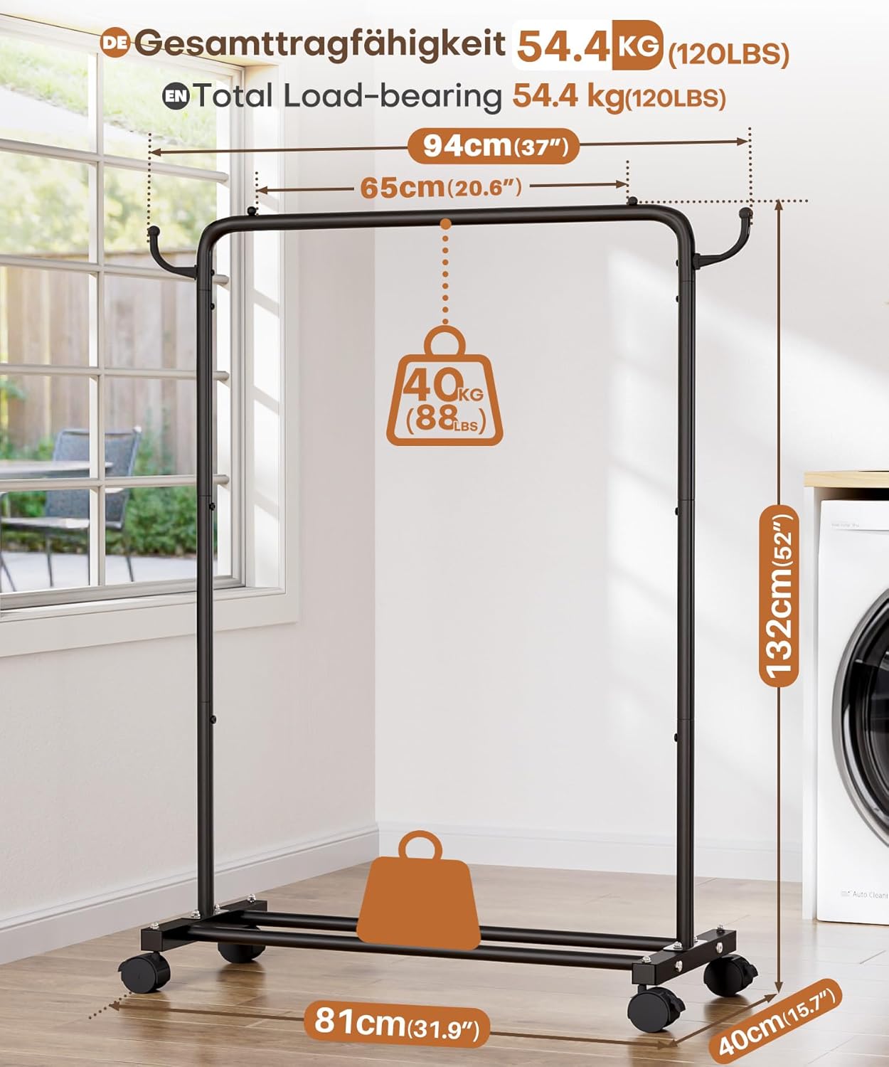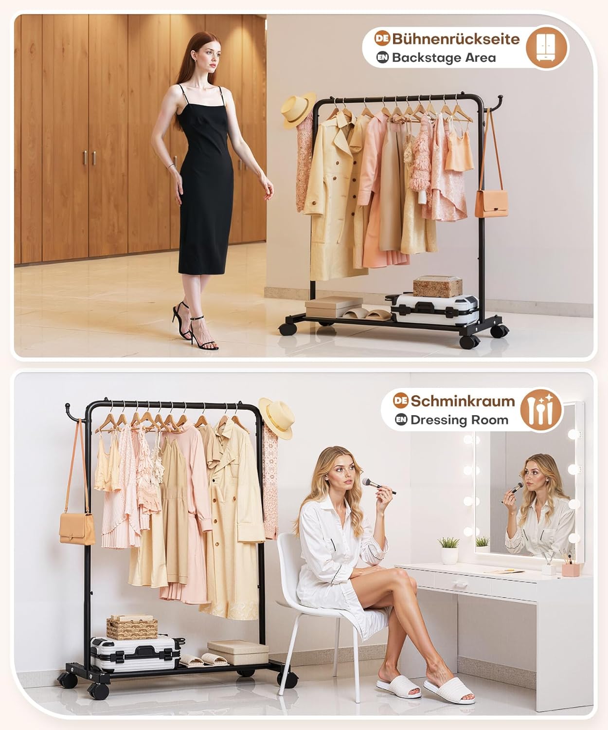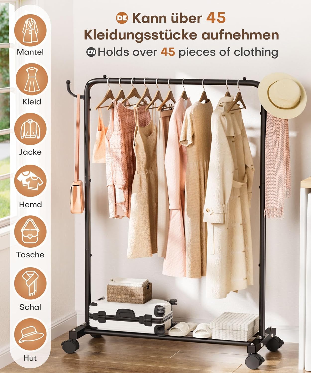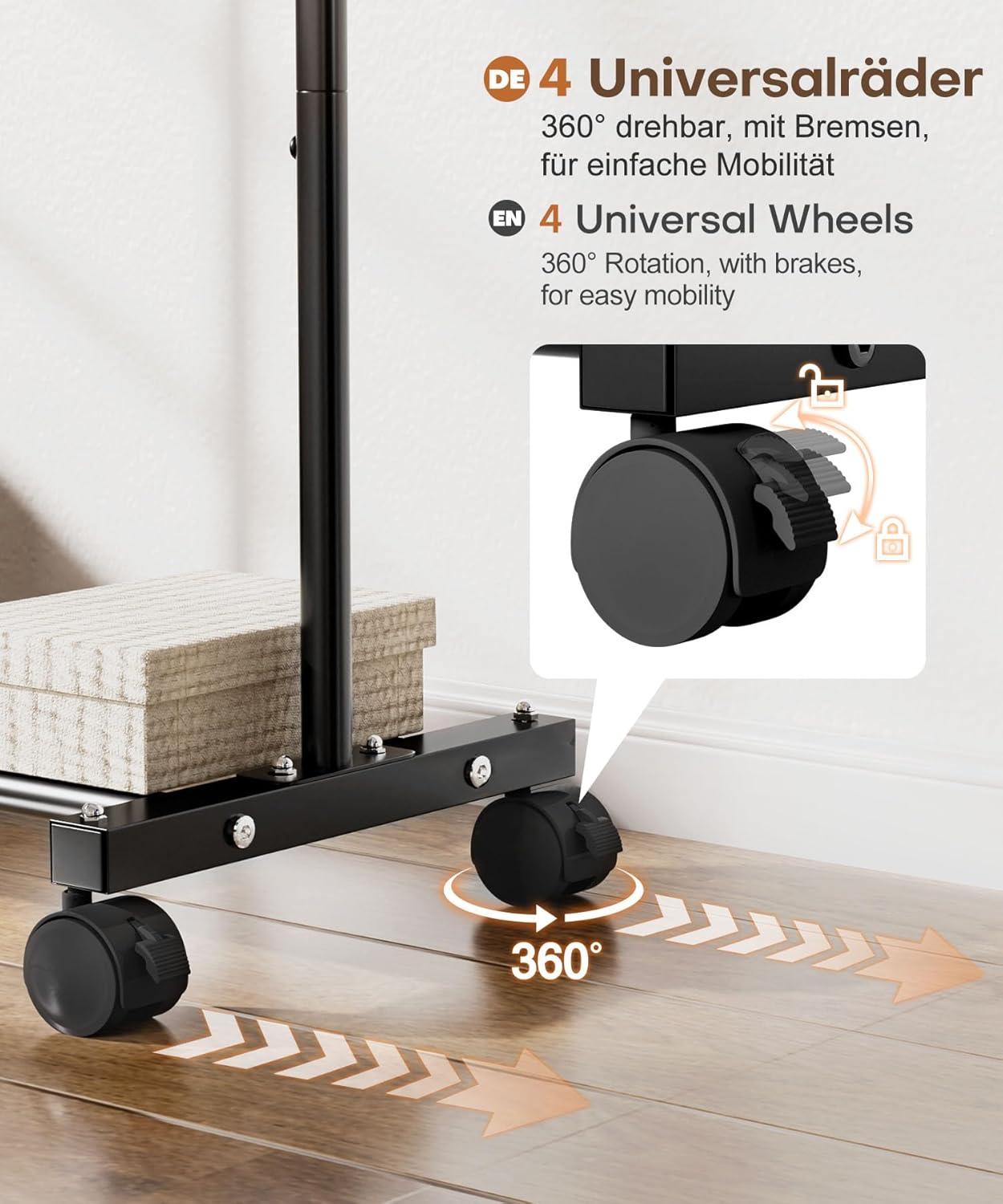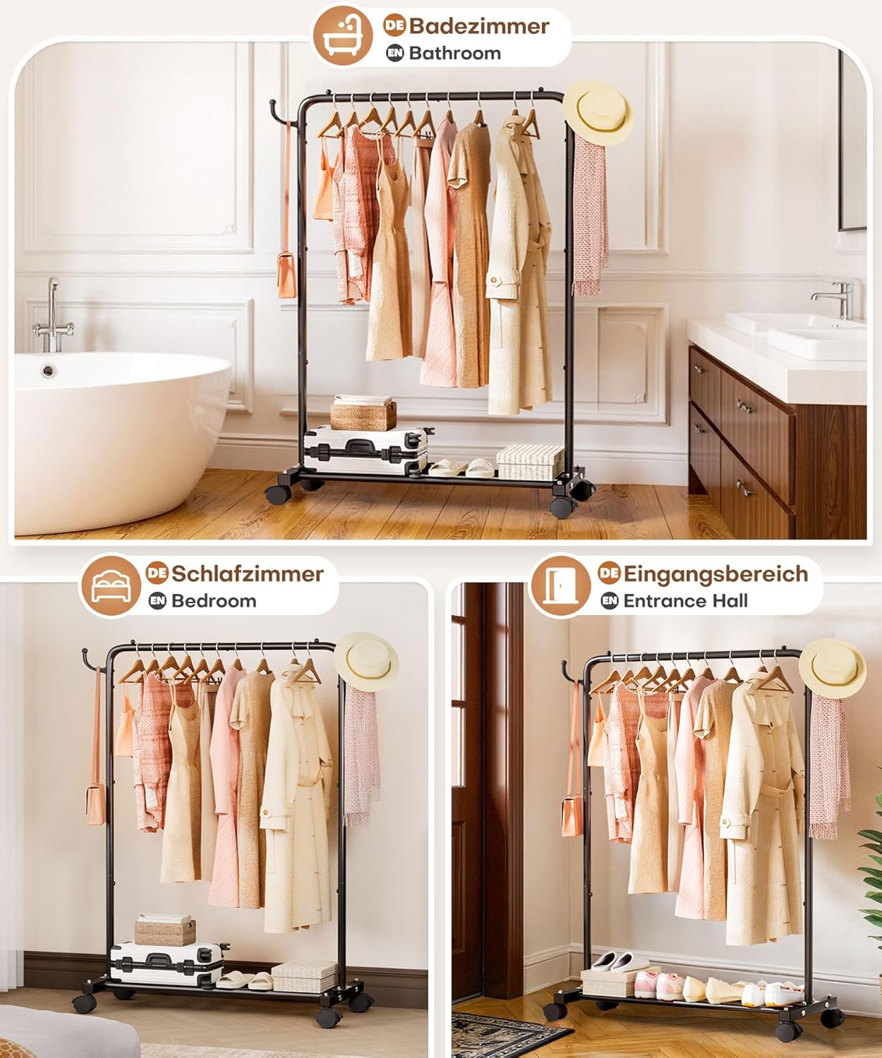 • Mehrzweck-Kleiderständer für zu Hause/Geschäft: Rollen Sie ihn zwischen Schlafzimmer (Kleideraufbewahrung), Eingangsbereich (Garderobenständer), Wäschekammer (Wäschständer) und Boutique (Kleidervitrine). Der kompakte 81 cm breite x 132 cm hohe