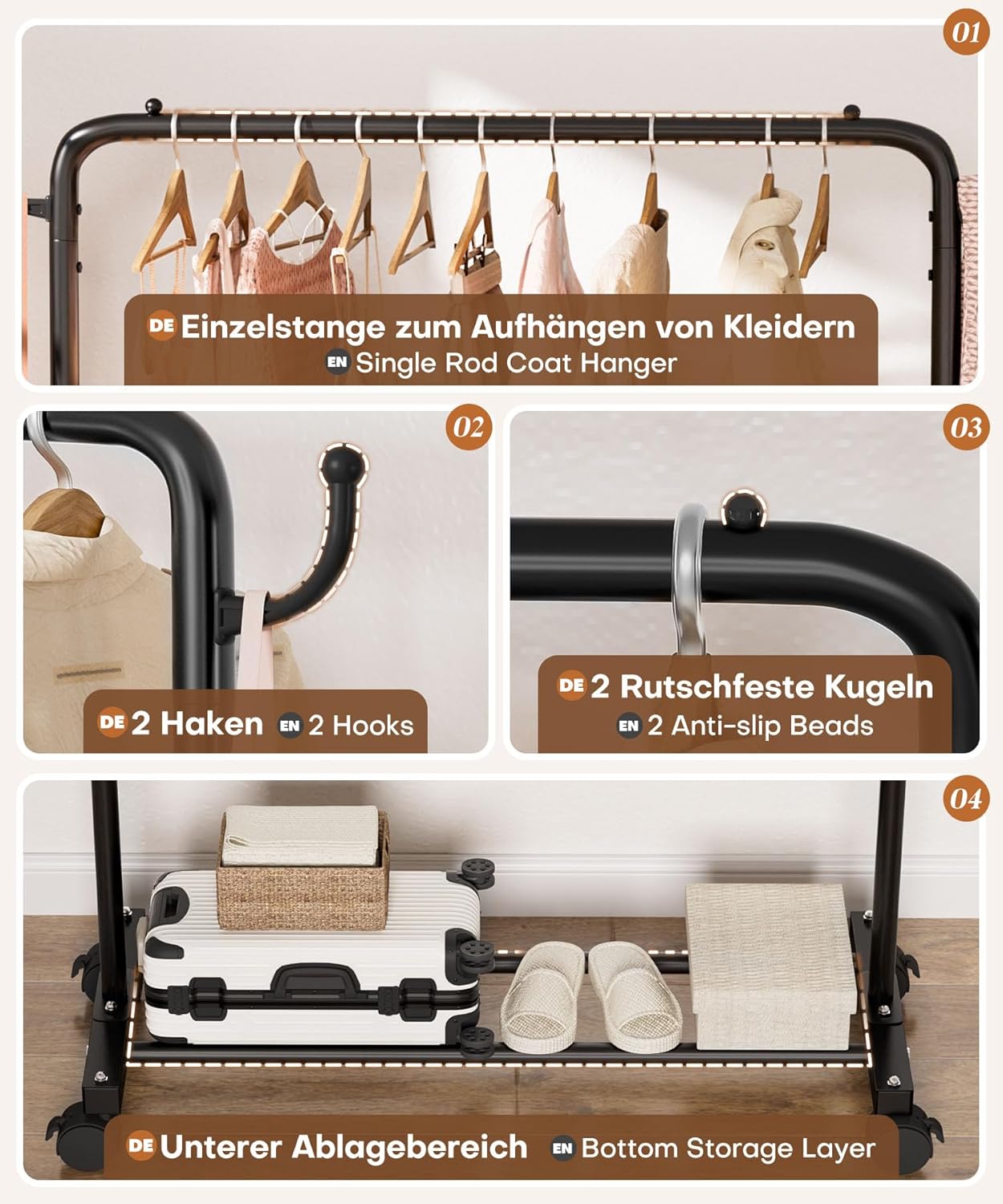 • Vielseitige Kleiderstange: Stange, Haken und Ablagen: Hemden/Kleider an der Metallstange aufhängen, Taschen/Hüte an den Seitenhaken und Schuhe/Gepäck am Doppelstangensockel lagern. Schnell von einem Kleiderschrank in eine Reisegarderobe oder eine