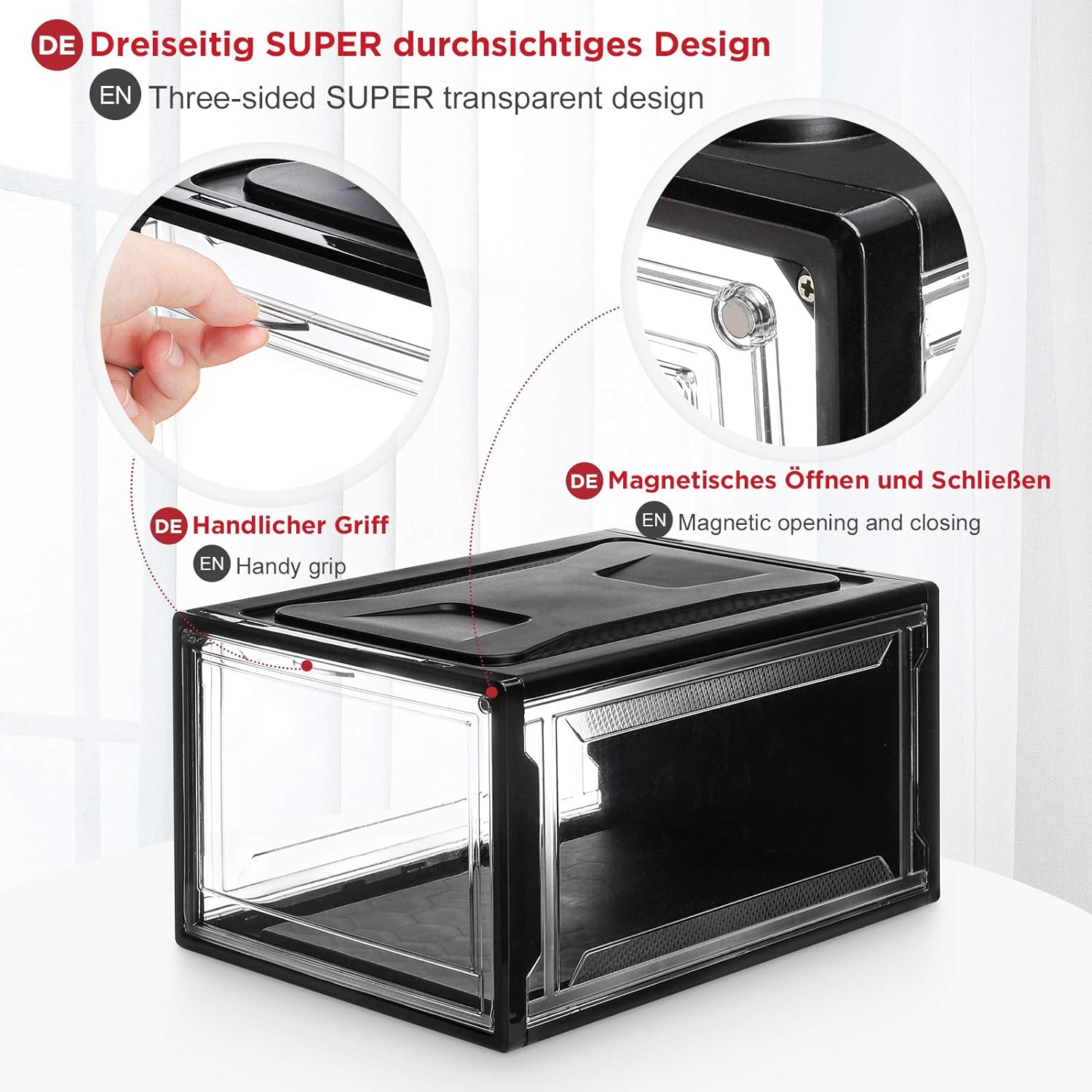 • 【SUPER durchsichtiges Design】Neues Material-Upgrade im Jahr 2021 unter Verwendung von hochauflösendem transparentem Material. Durch das dreiseitig durchsichtige Schuhbox-Design, können Sie den Inhalt der Box sehen, ohne sie zu öffnen, sodass Sie