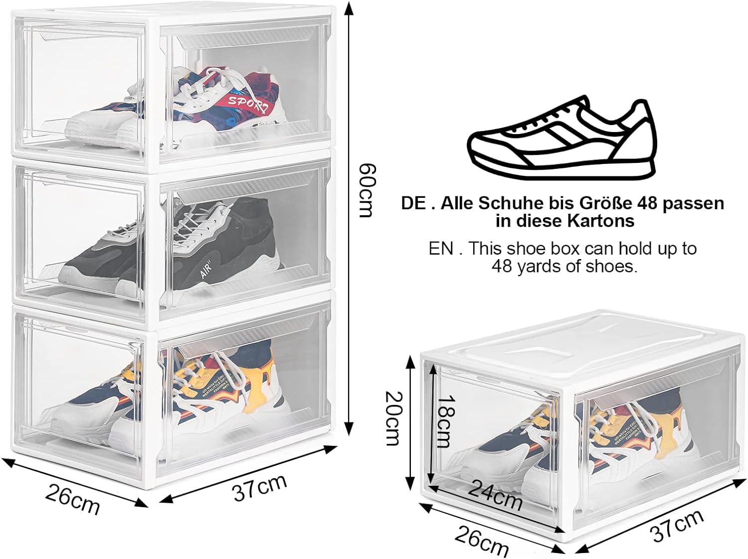 - 【Mit grossem Fassungsvermögen + Hochwertiges Material】Jede Box ist gross genug, Alle Schuhe bis Grösse 48 passen in diese Kartons. Die Boxen bestehen aus neuartigem PP-Material, welches sicher, umweltfreundlich und geruchsneutral ist. Die Wände sind dick genug, damit die Box nicht so leicht beschädigt werden kann. Sie besitzt eine hohe Belastbarkeit und kann Druck und Verformungen standhalten.