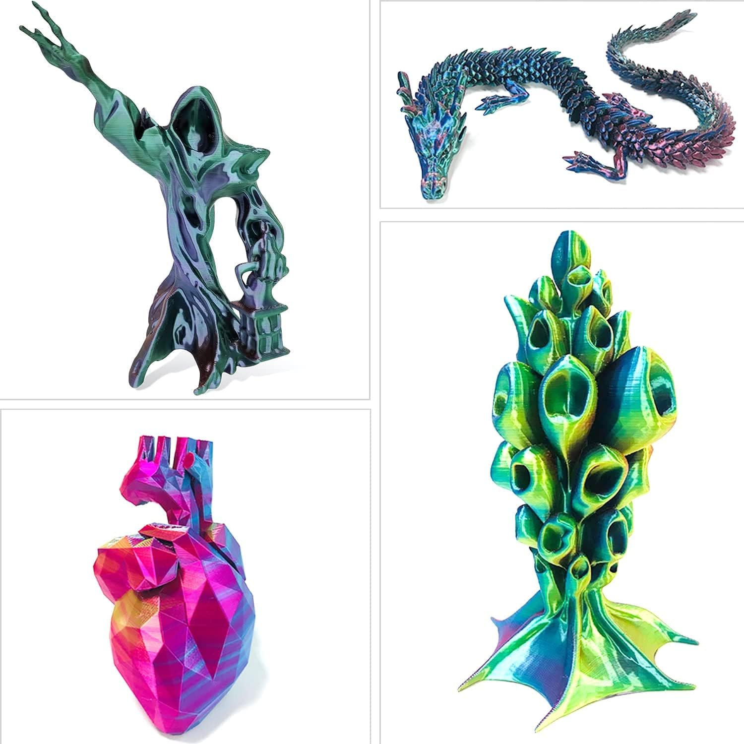 - 【Attraktives PLA Filament】Seiden Grün/Lila/Kupfer Kombination aus PLA Filament in magischer Farbe, drei farbig im selben Filament.Dreifarbige Koextrusion, druckt ein glattes Aussehen mit seidigem Glanz, zeigt verschiedene Farben in verschiedenen