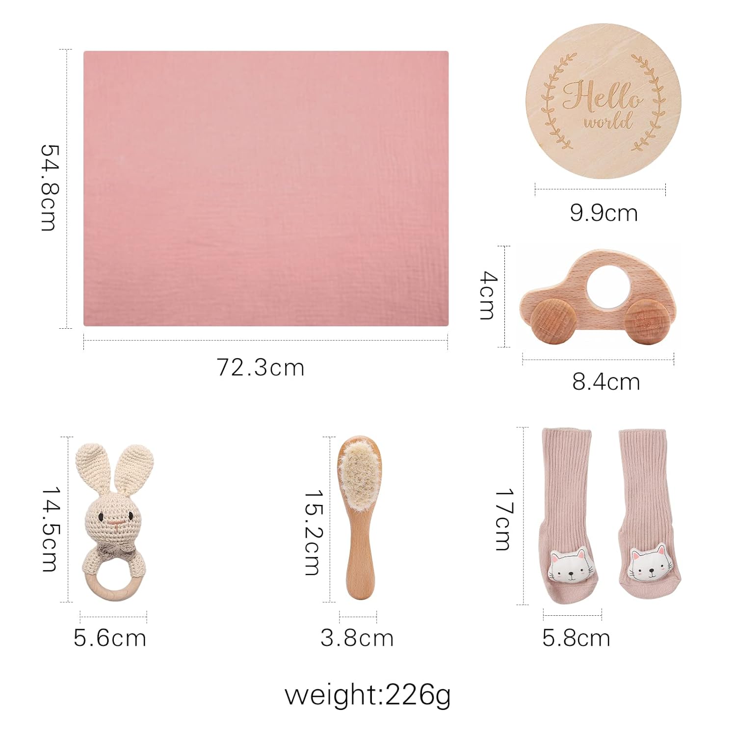 - đăSechsteiliges SetăAlles befindet sich in einer attraktiven quadratischen Burlywood-Geschenkbox. Enthalten sind ein Baumwollbadetuch, eine Rassel, eine HolzbĂŒrste, eine Hello World-Holzkarte, ein Holzauto und Socken zur BegrĂŒssung des sĂŒssen