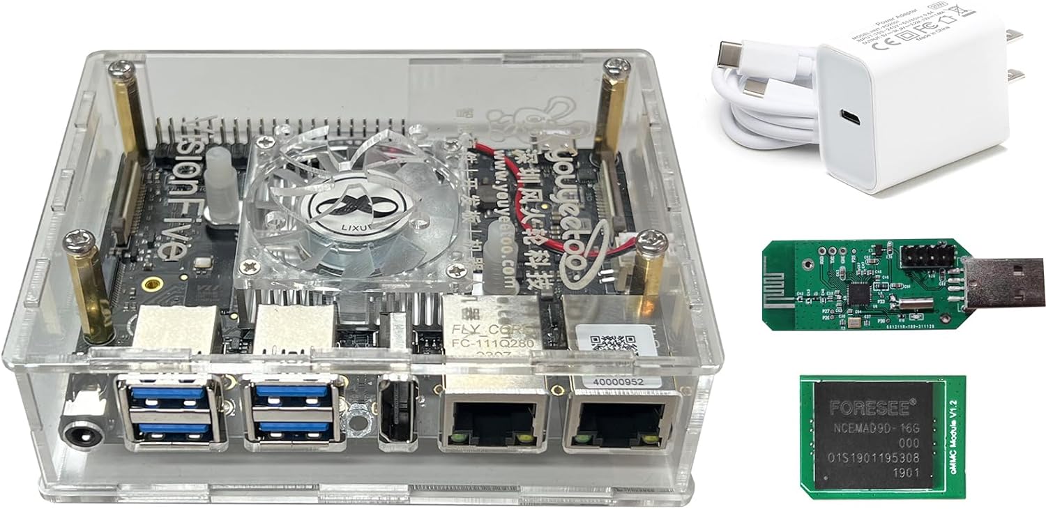 - Lieferumfang:1x VisionFive2 mit WiFi Modul, 1x 20W PD Netzteil (EU), 1x 16GB eMMC, 1x Acrylgehäuse, 1x Lüfterkühler.