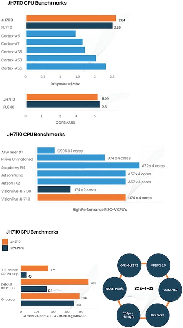 - [RISC-V SBC] Der VisionFive2 ist mit einer Quad-Core 64-Bit RV64GC ISA-Chip-Plattform (SoC) mit einer Arbeitsfrequenz von bis zu 1,5 GHz und integrierter IMG BXE-4-32 3D-GPU ausgestattet und unterstützt OpenCL 3.0, OpenGL ES 3.2 und Vulkan 1.2.