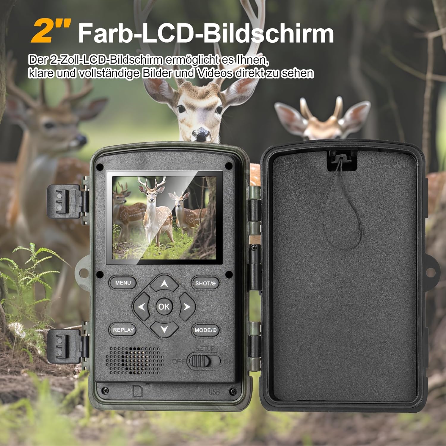- FOTOS UND VIDEOS IN ULTRAHOHER AUFLÖSUNG. Die HD 2.7K Audio Videos und 48MP Bilder der Wildkamera fangen die komplizierten Details von Wildtieren mit unübertroffener Klarheit ein. Der integrierte 2,0 Zoll Farb LCD Bildschirm ermöglicht es Ihnen,