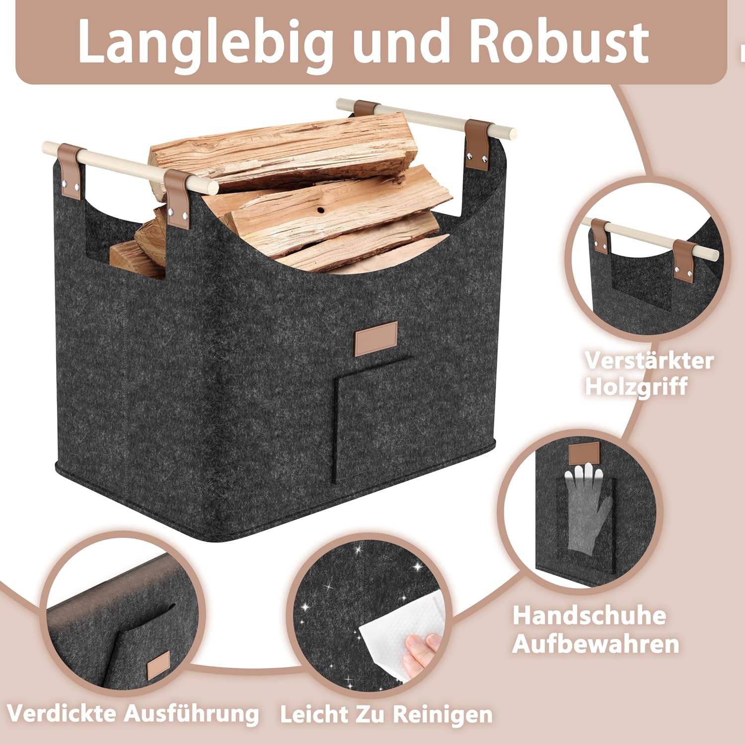 - Robust und langlebig: Der Kaminholzkorb mit verstärkten Nähten und Holzgriffen trägt bis zu 40 kg und ist schmutz- sowie abriebfest. Ideal für die langfristige Nutzung und widerstandsfähig auch bei hoher Belastung