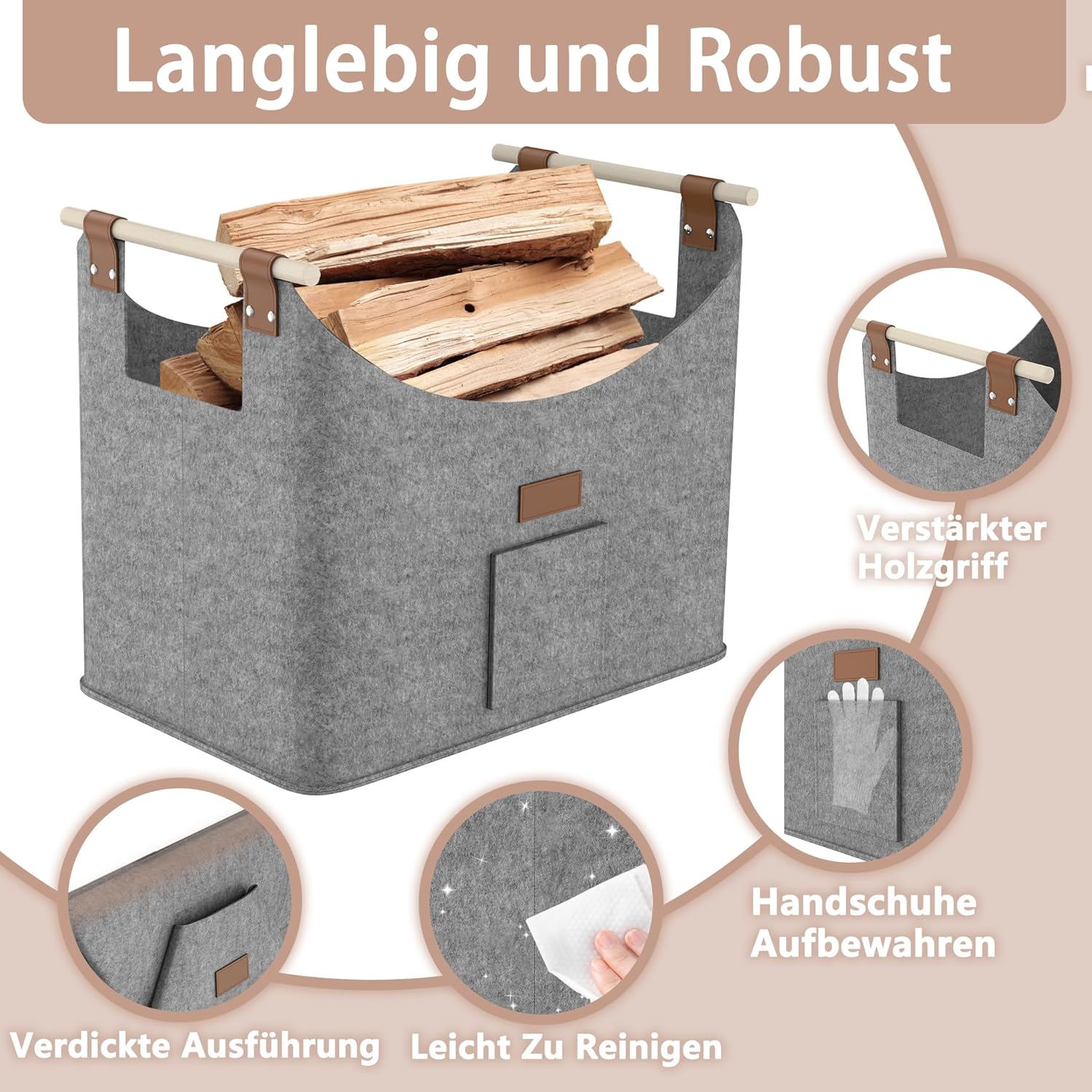 - Robust und langlebig: Der Kaminholzkorb mit verstärkten Nähten und Holzgriffen trägt bis zu 40 kg und ist schmutz- sowie abriebfest. Ideal für die langfristige Nutzung und widerstandsfähig auch bei hoher Belastung