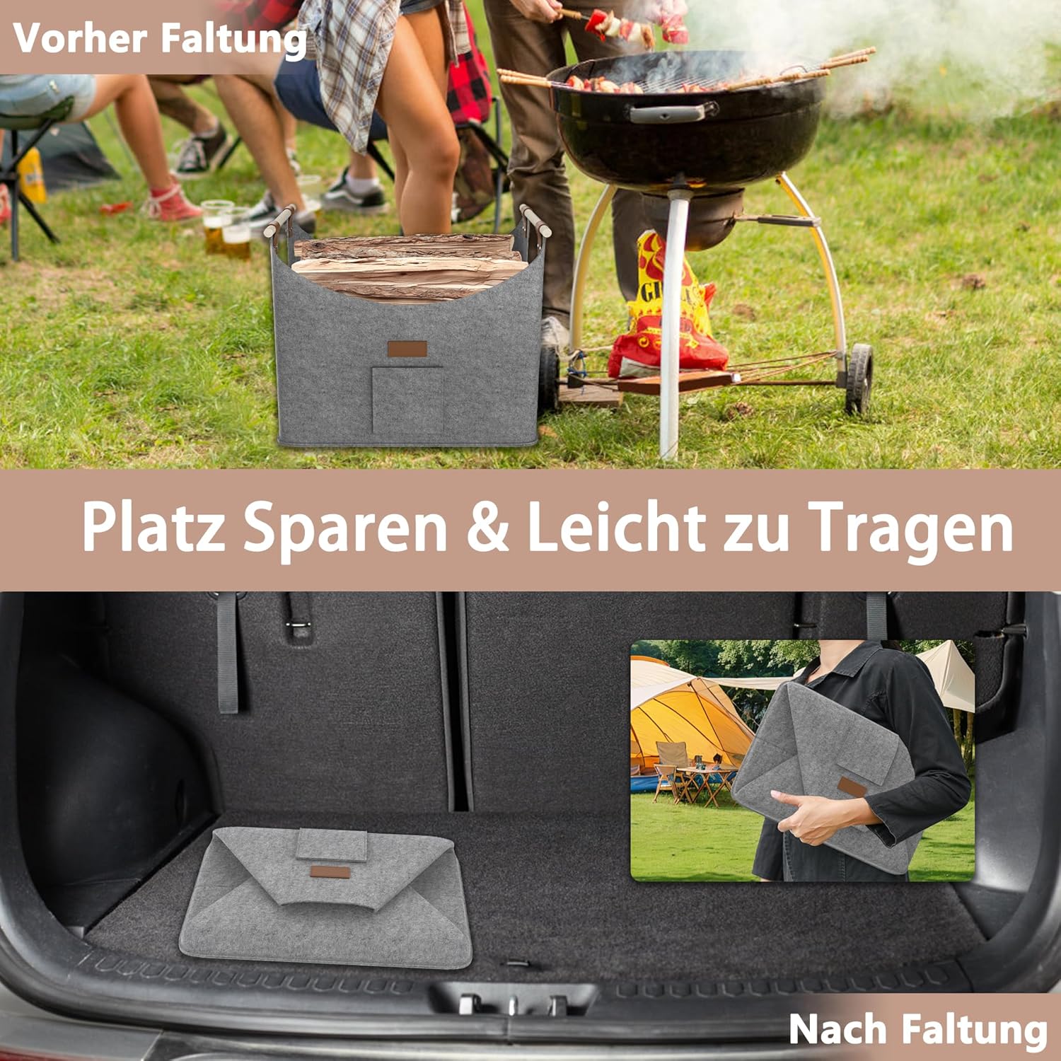 - Leicht und platzsparend: Der Brennholzkorb ist leicht, einfach zu transportieren und lässt sich zusammenfalten. So kann er platzsparend verstaut werden – ideal für flexible Aufbewahrung