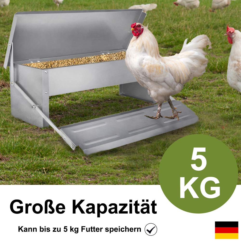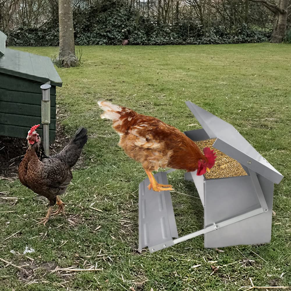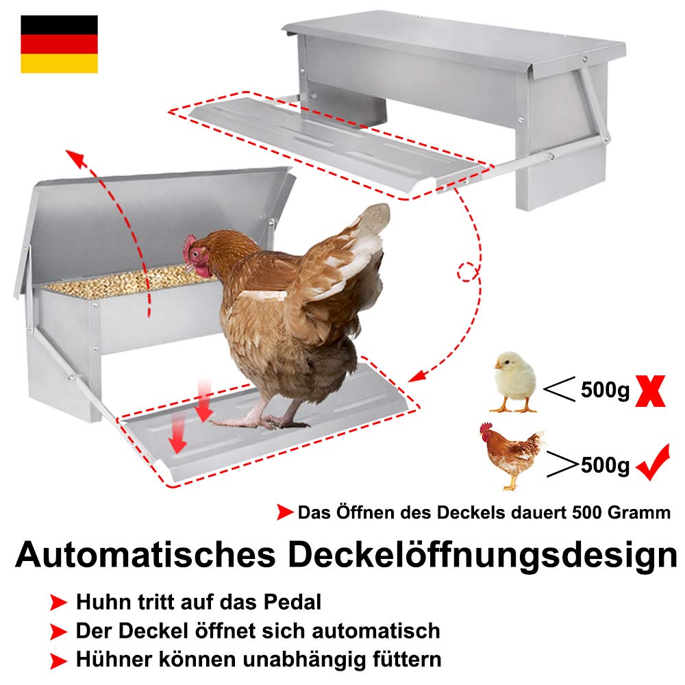 - 🐥 【Saubere und frische Futterlagerung】: Verhindert den Diebstahl von Futter durch Wildvögel, Ratten und Mäuse. Das automatische Profildesign ermöglicht es den Hühnern, auf der Querstange des Futtertrogs zu stehen, wodurch dieser automatisch
