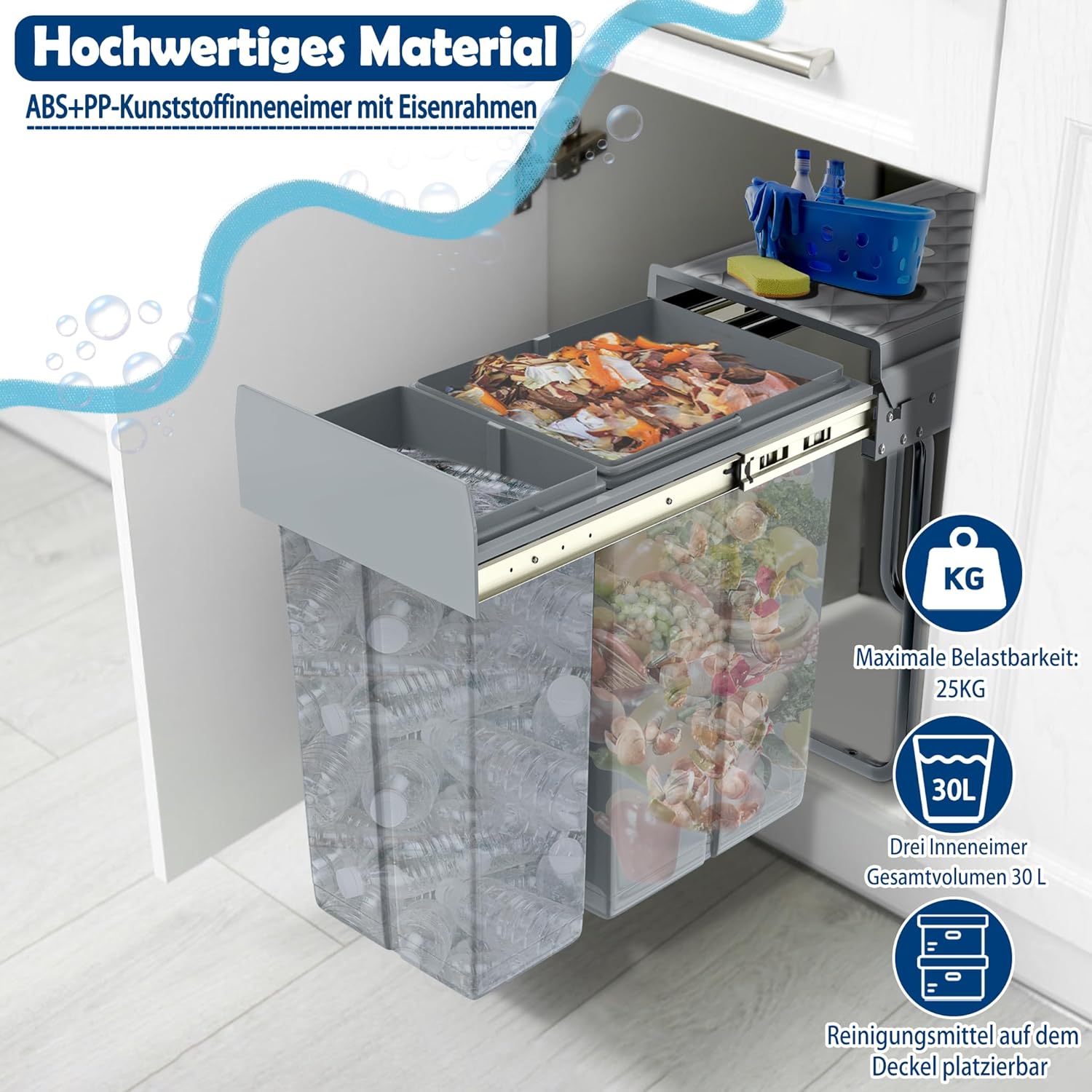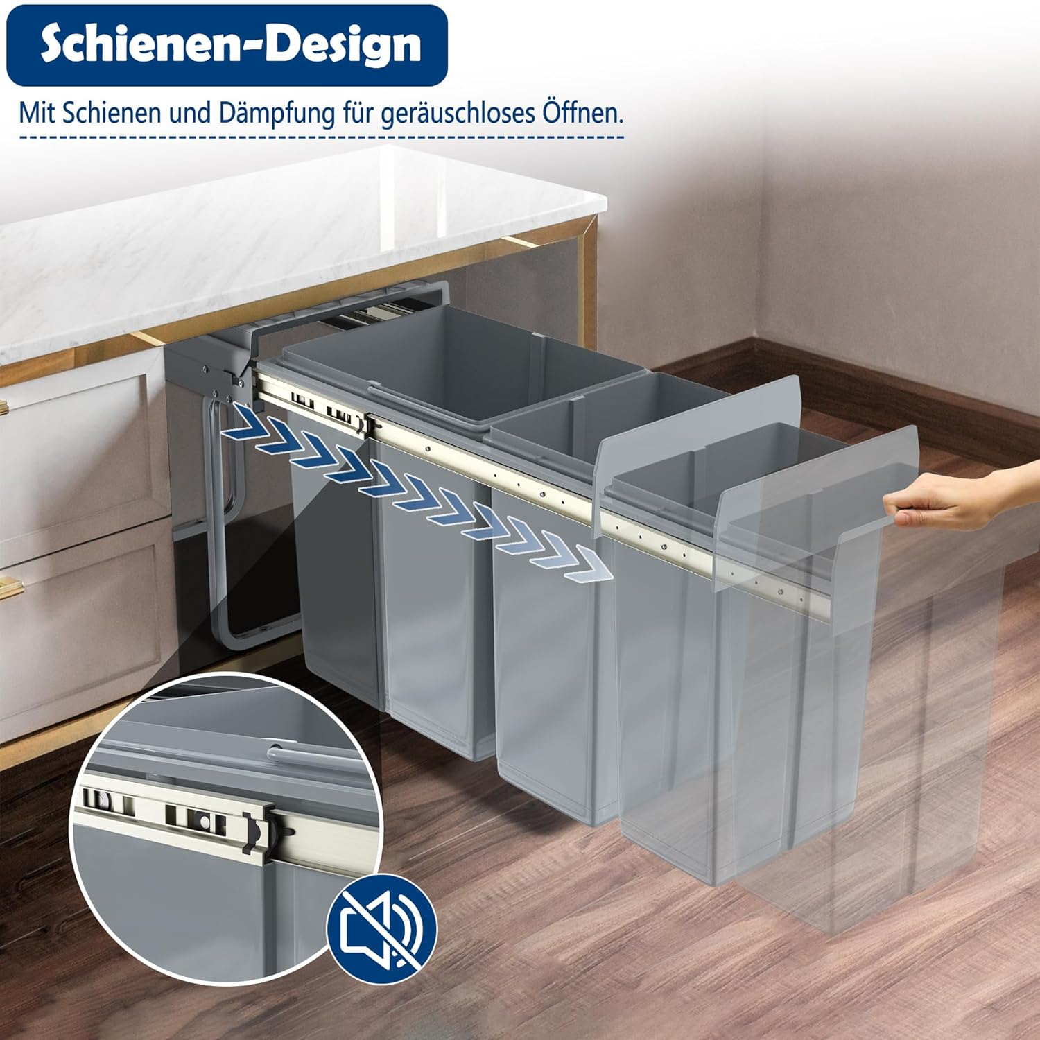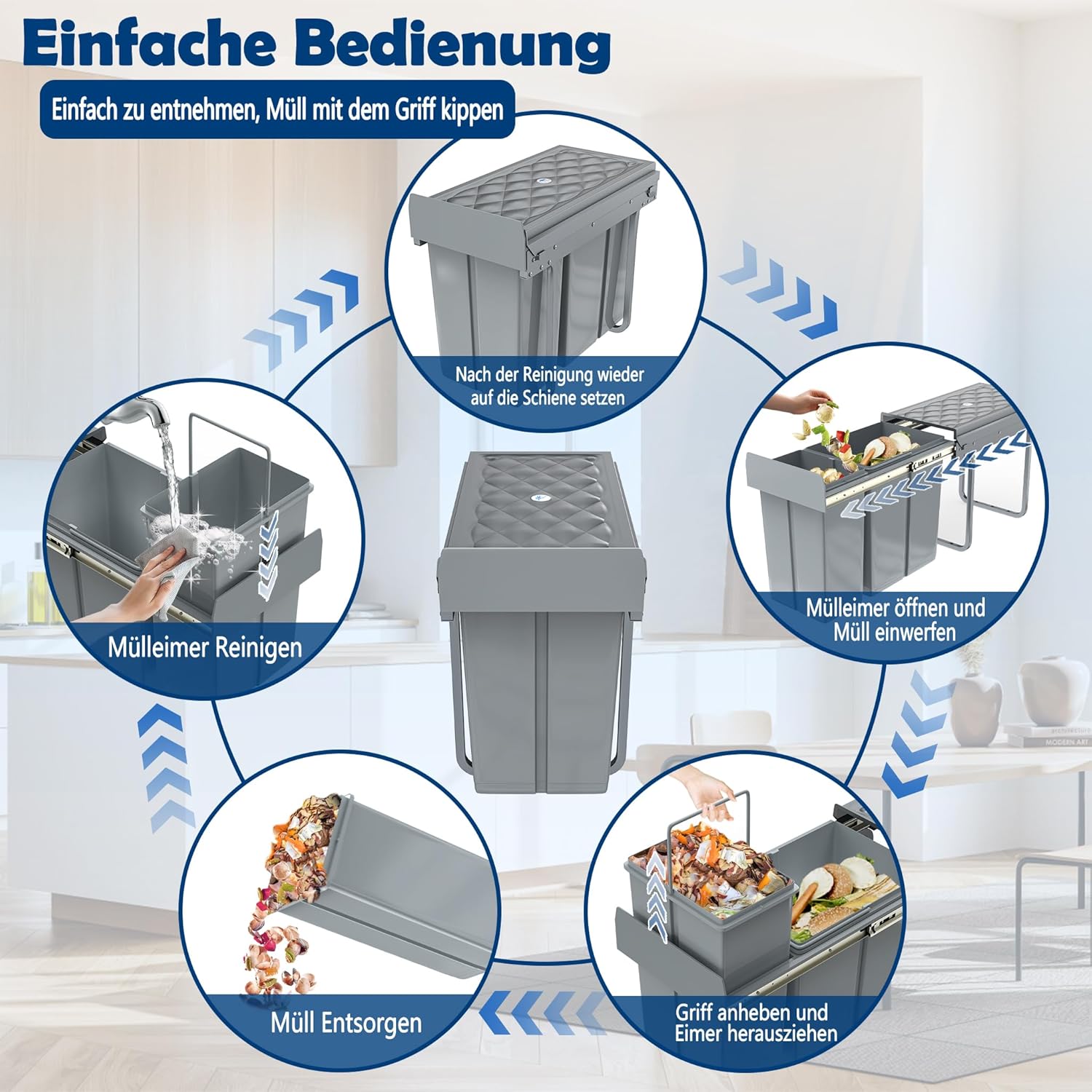 - Komfortabel & benutzerfreundlich: Der Mülleimer gleitet mühelos auf stabilen Führungsschienen, die eine geräuscharme und sanfte Bewegung ermöglichen. Die ergonomischen Handgriffe sorgen für eine bequeme und unkomplizierte Bedienung
