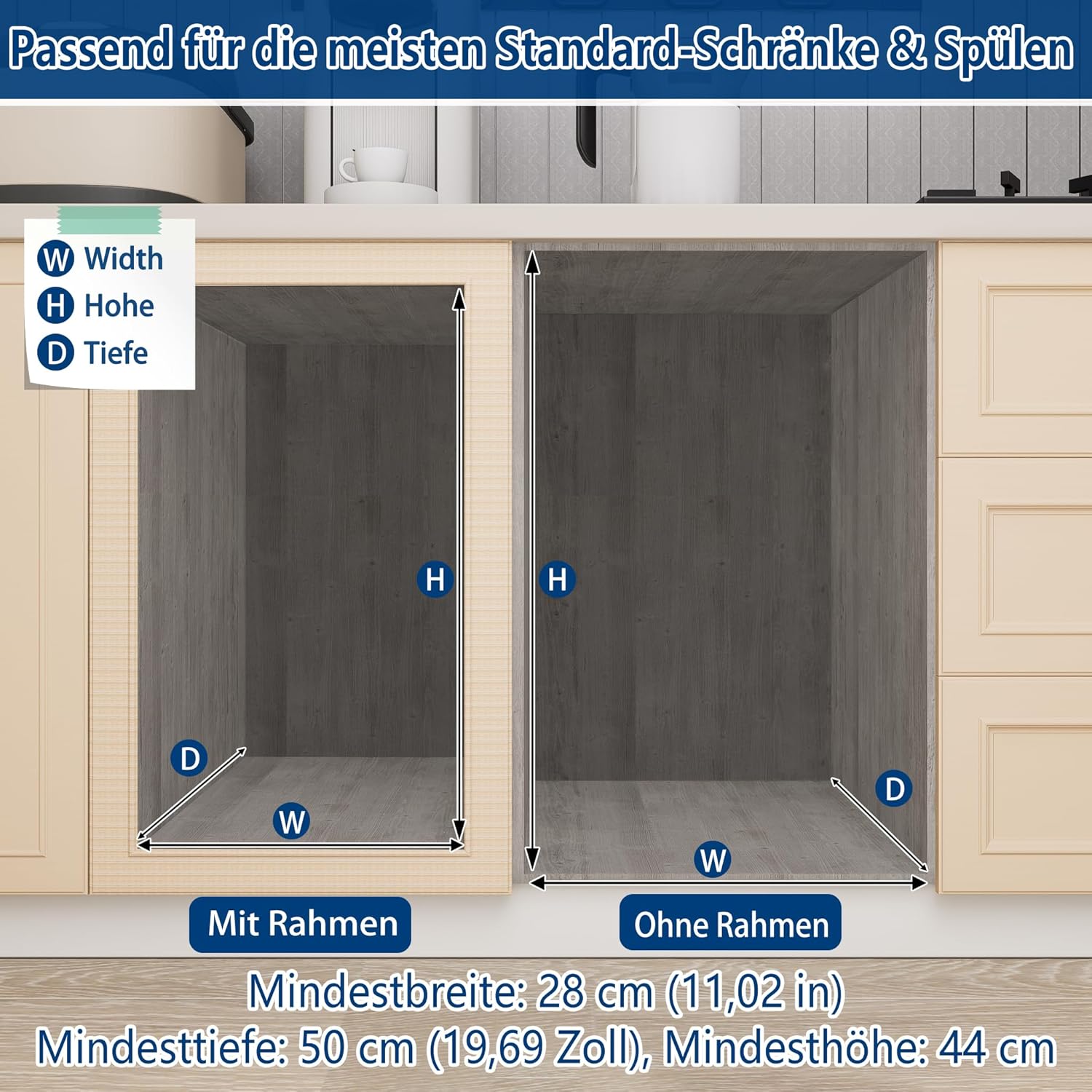 - Platzsparendes Design: Dank der kompakten Bauweise passt dieser Einbaumülleimer in nahezu jeden Küchenschrank. Der Deckel bietet eine praktische Ablagefläche für Müllbeutel und andere Utensilien, sodass der Stauraum optimal genutzt w
