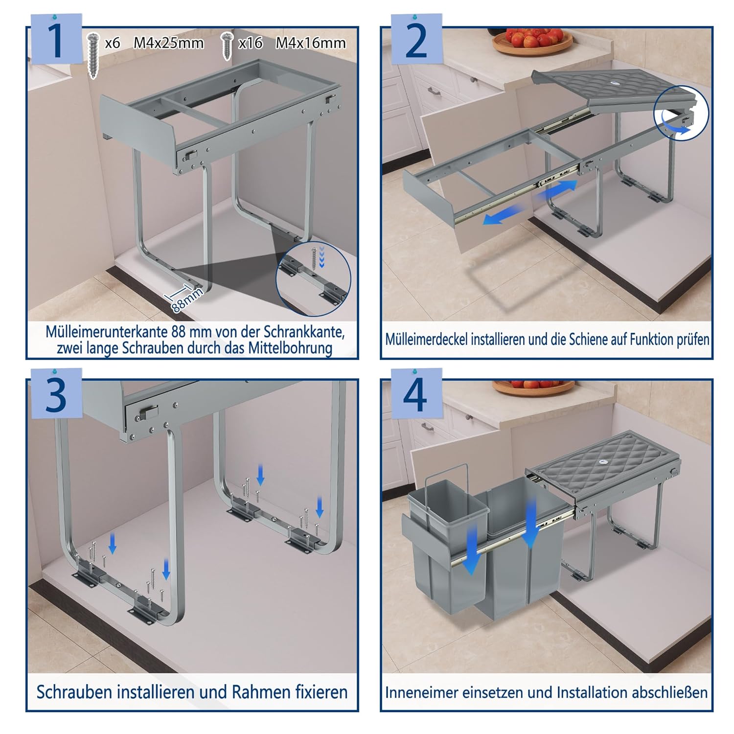 - Einfache Installation: Mit dem beiliegenden Montagezubehör ist der Mülleimer in Schränken ab 40 cm Breite einfach zu installieren. Nur vier Schrauben werden benötigt, um den Eimer sicher zu montieren, ohne dass aufwendige Messungen nötig sind