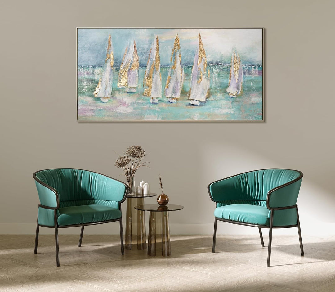 YS-Art Abstrakt Acryl Gemälde auf Leinwand handgemalt Segelboote Wandbilder Wohnzimmer moderne blaue