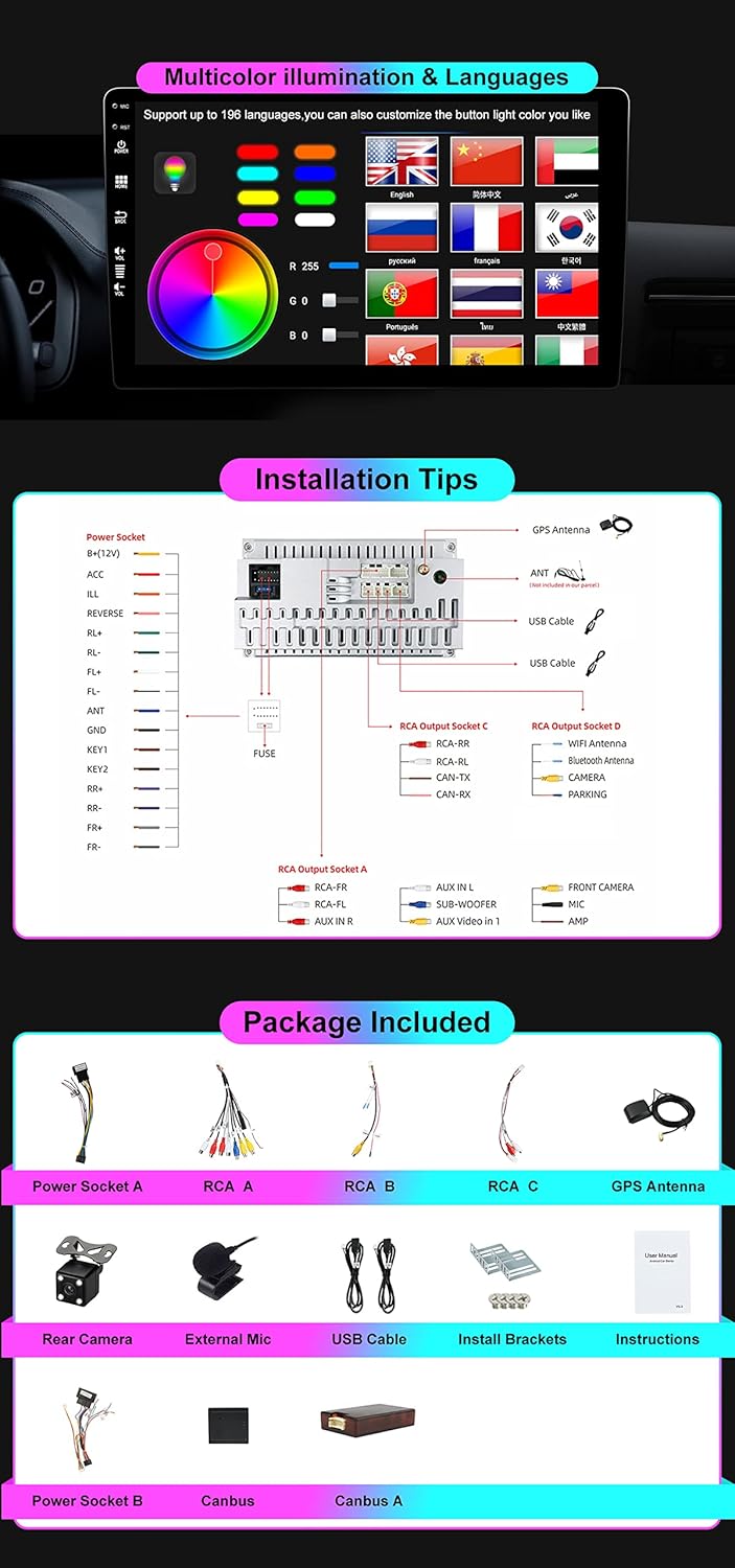 • 【Lieferumfang】 1 x Netzkabel / 1 x RCA-Ausgangskabel A / 1 x RCA-Ausgangskabel B / 1 x RCA-Ausgangskabel C / 1 x GPS-Antenne / 2 x USB-Kabel / 1 x Funkantenne / 1 x Rückfahrkamera / 1 x externes Mikrofon / 1 x Autoradio / 1 x Bedienungsanleitung