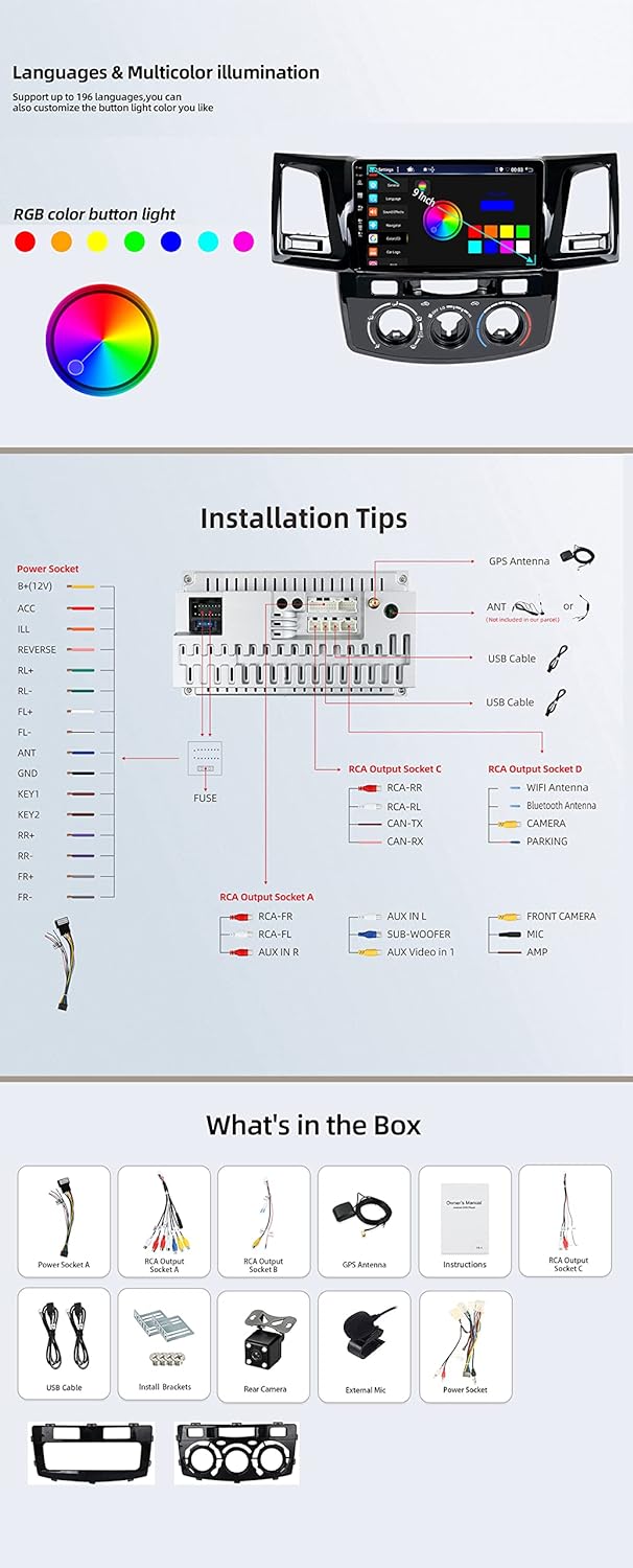 - 【Lieferumfang】 1 x Netzkabel / 1 x RCA-Ausgangskabel A / 1 x RCA-Ausgangskabel B / 1 x RCA-Ausgangskabel C / 1 x GPS-Antenne / 2 x USB-Kabel / 1 x Funkantenne / 1 x Rückfahrkamera / 1 x externes Mikrofon / 1 x Autoradio / 1 x Bedienungsanleitung