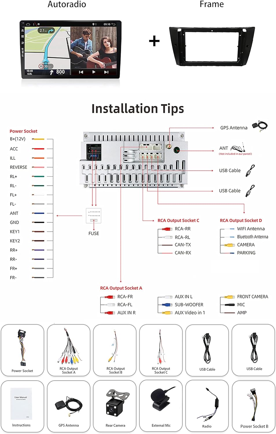 • 【Lieferumfang】 1 x Netzkabel / 1 x RCA-Ausgangskabel A / 1 x RCA-Ausgangskabel B / 1 x RCA-Ausgangskabel C / 1 x GPS-Antenne / 2 x USB-Kabel / 1 x Funkantenne / 1 x Rückfahrkamera / 1 x externes Mikrofon / 1 x Autoradio / 1 x Bedienungsanleitung