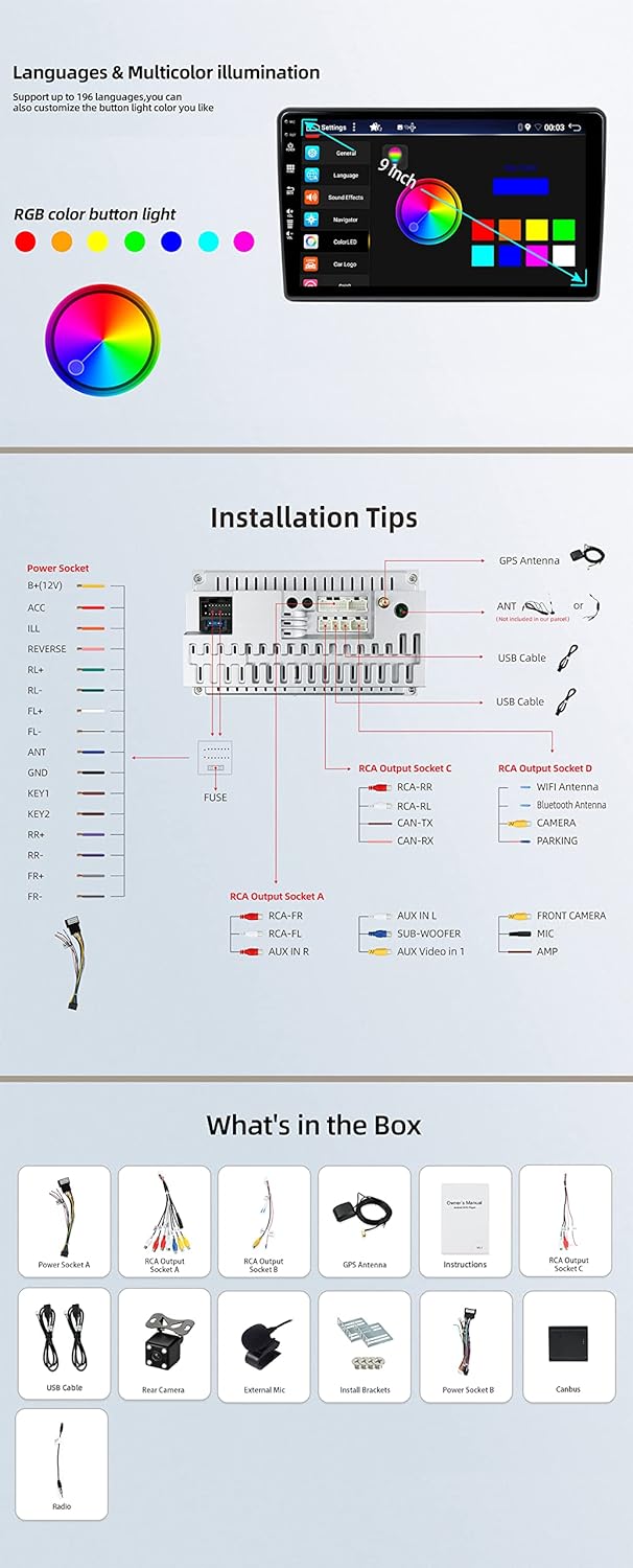 - 【Lieferumfang】 1 x Netzkabel / 1 x RCA-Ausgangskabel A / 1 x RCA-Ausgangskabel B / 1 x RCA-Ausgangskabel C / 1 x GPS-Antenne / 2 x USB-Kabel / 1 x Funkantenne / 1 x Rückfahrkamera / 1 x externes Mikrofon / 1 x Autoradio / 1 x Bedienungsanleitung