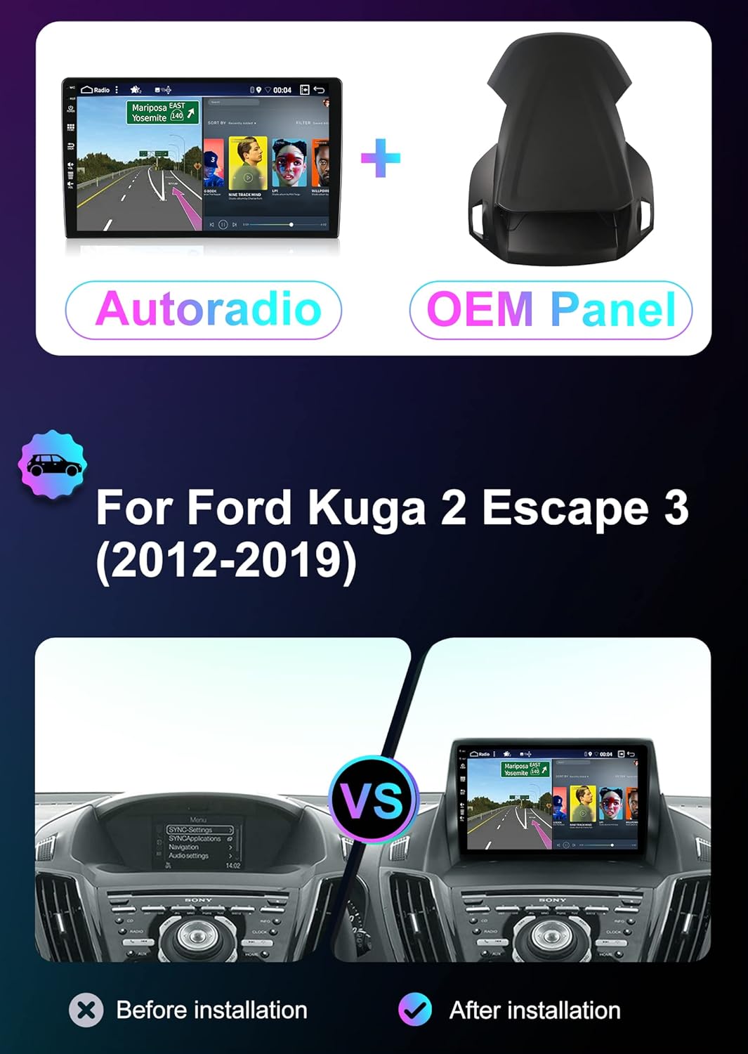 - 【KOMPATIBILITÄT】 Autoradio kompatibel mit Ford Kuga (2013-2017) .Bitte überprüfen Sie die Abmessungen vor dem Kauf. Wenn Sie sich nicht sicher sind, kontaktieren Sie uns bitte mit dem Foto des Dashboards: yuntx_techsupport@163.com