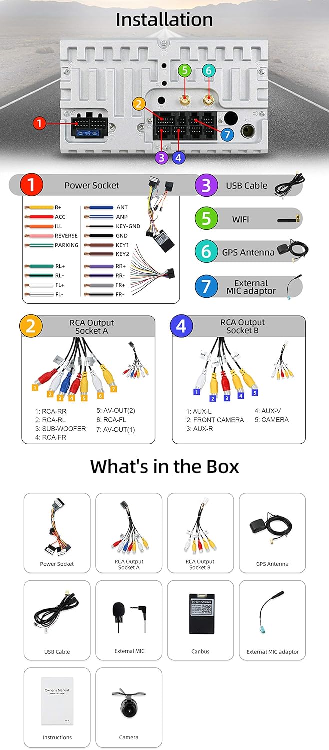 - 【Packungsinhalt】 1 x Netzkabel / 1 x Cinch-Ausgangskabel A / 1 x Cinch-Ausgangskabel B / 1 x GPS-Antenne / 1 x USB-Kabel / 1 x GPS-Antenne / 1 x Rückfahrkamera /1 x Autoradio / 1 x Benutzer Handbuch