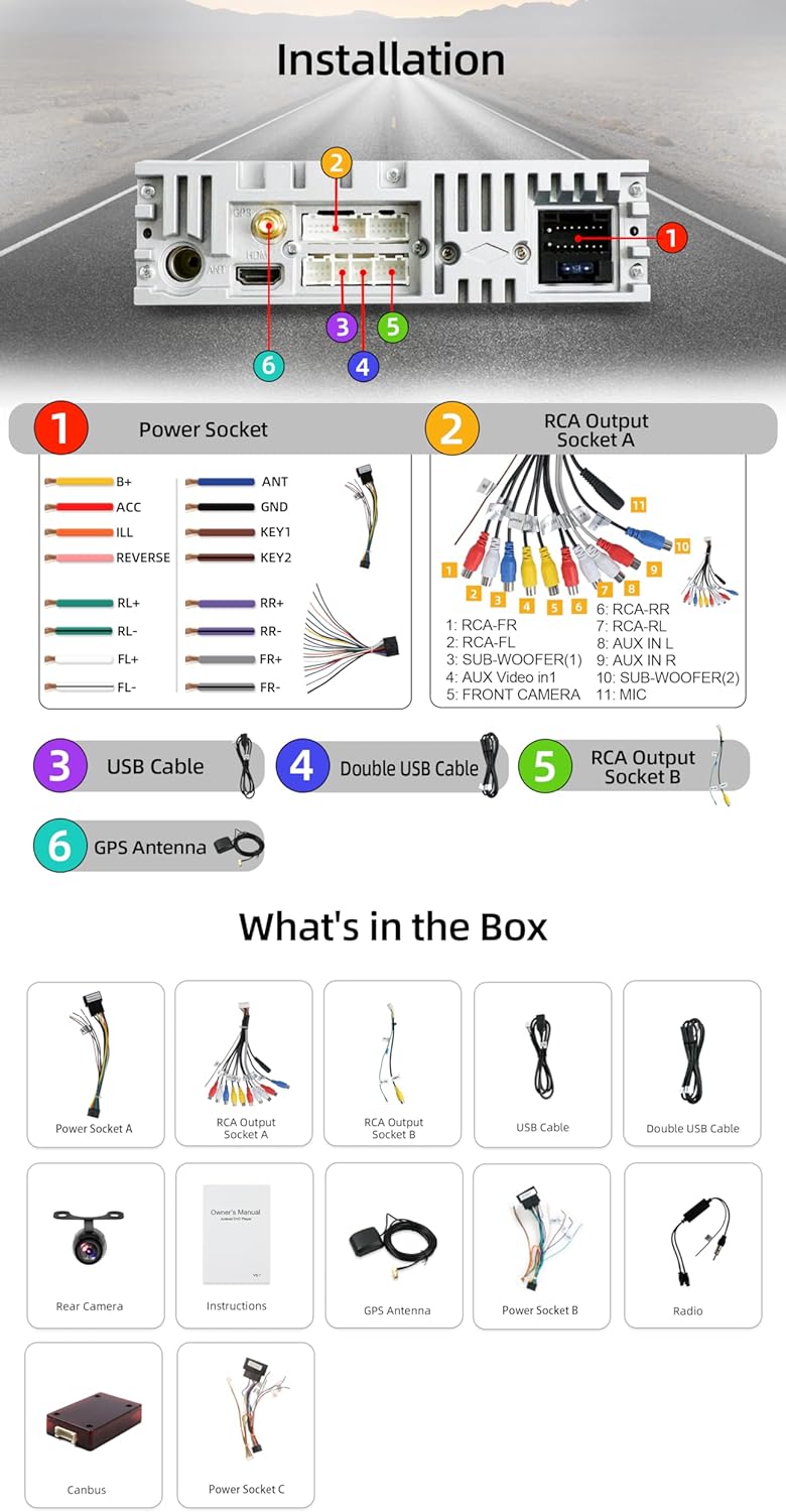 - 【WAS IST IN DER BOX】 2 x Stromanschluss / 1 x Cinch-Ausgangsbuchse A / 1 x Cinch-Ausgangsbuchse B / 1 x GPS-Antenne / 2 x USB-Kabel / 1 x Radioantenne / 1 x Canbus / 1 x Rückfahrkamera / 1 x Bedienungsanleitung