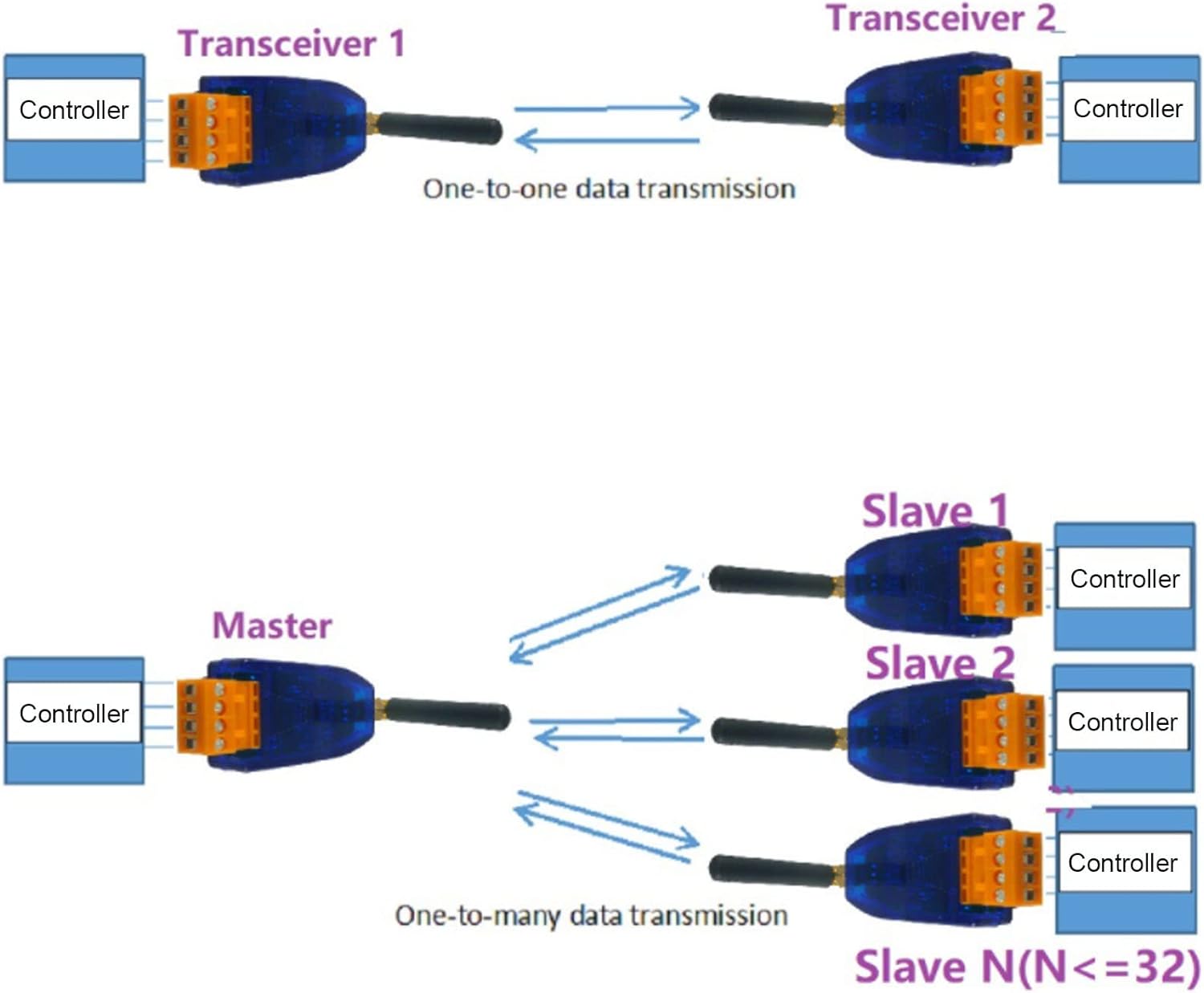 - Die Funktionsweise ist die gleiche wie bei einem kabelgebundenen RS485-Bus: Master-Gerät sendet Daten, Slave-Geräte können alle Daten empfangen, jedes Slave-Gerät sendet Daten, Master-Gerät und die anderen Slave-Geräte können empfangen. (Wenn