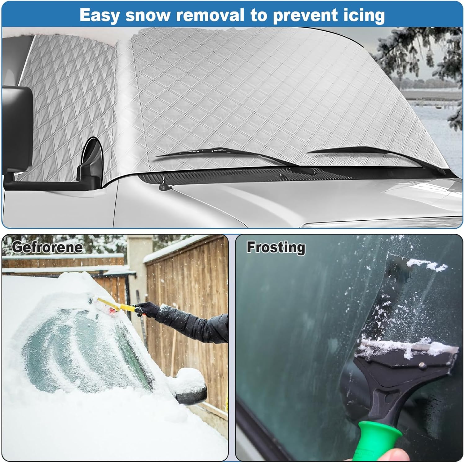 - Einfach zu installieren: Sicher mit Seitenklappen und Klettverschluss-Design, ohne zu verrutschen oder abzublasen. Zwei Befestigungen um die Aussenspiegel helfen der Frontscheibenabdeckung perfekt abzudecken und ein Verschieben zu vermeiden, wenn der