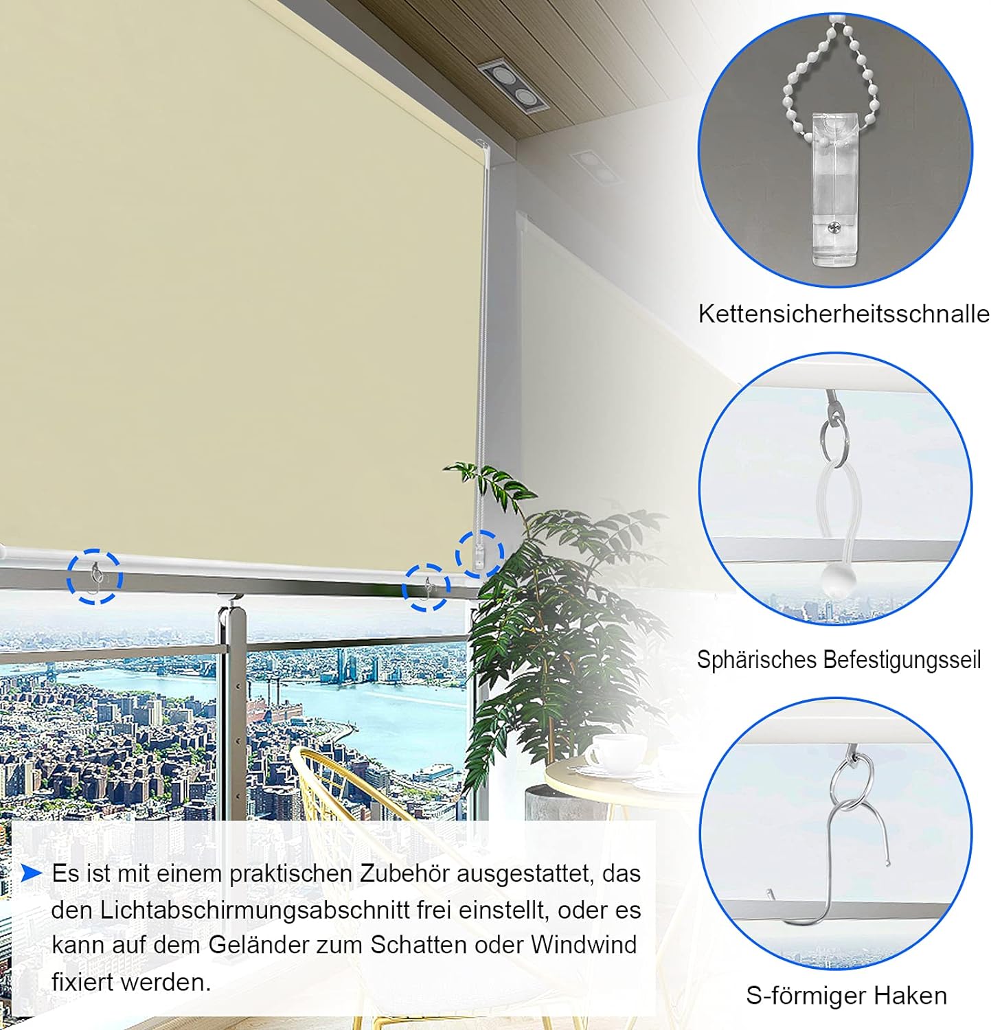 - Einfache Bedienung - Die Aussenjalousien müssen nur manuell auf die gewünschte Länge gezogen und dann verriegelt werden. Die Jalousien können bis zu 140 cm / 240 cm ausgezogen werden und können mit einem feuchten Tuch gereinigt werden.