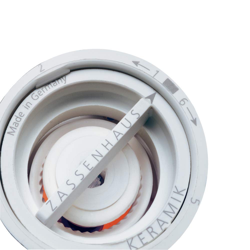 - KERAMIKMAHLWERK – MADE IN GERMANY – Das patentierte Zassenhaus-Mahlwerk ist härter als Stahl und absolut verschleiss- und korrosionsfrei. (Jede Mühle wird auf perfekte Funktionalität geprüft und wird deshalb mit einer kleinen Menge Pfeffer/Salz