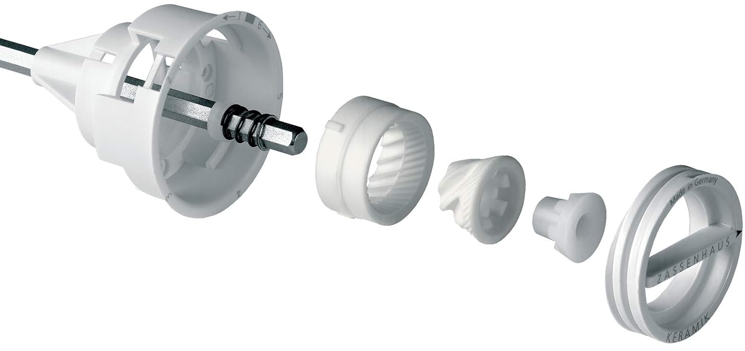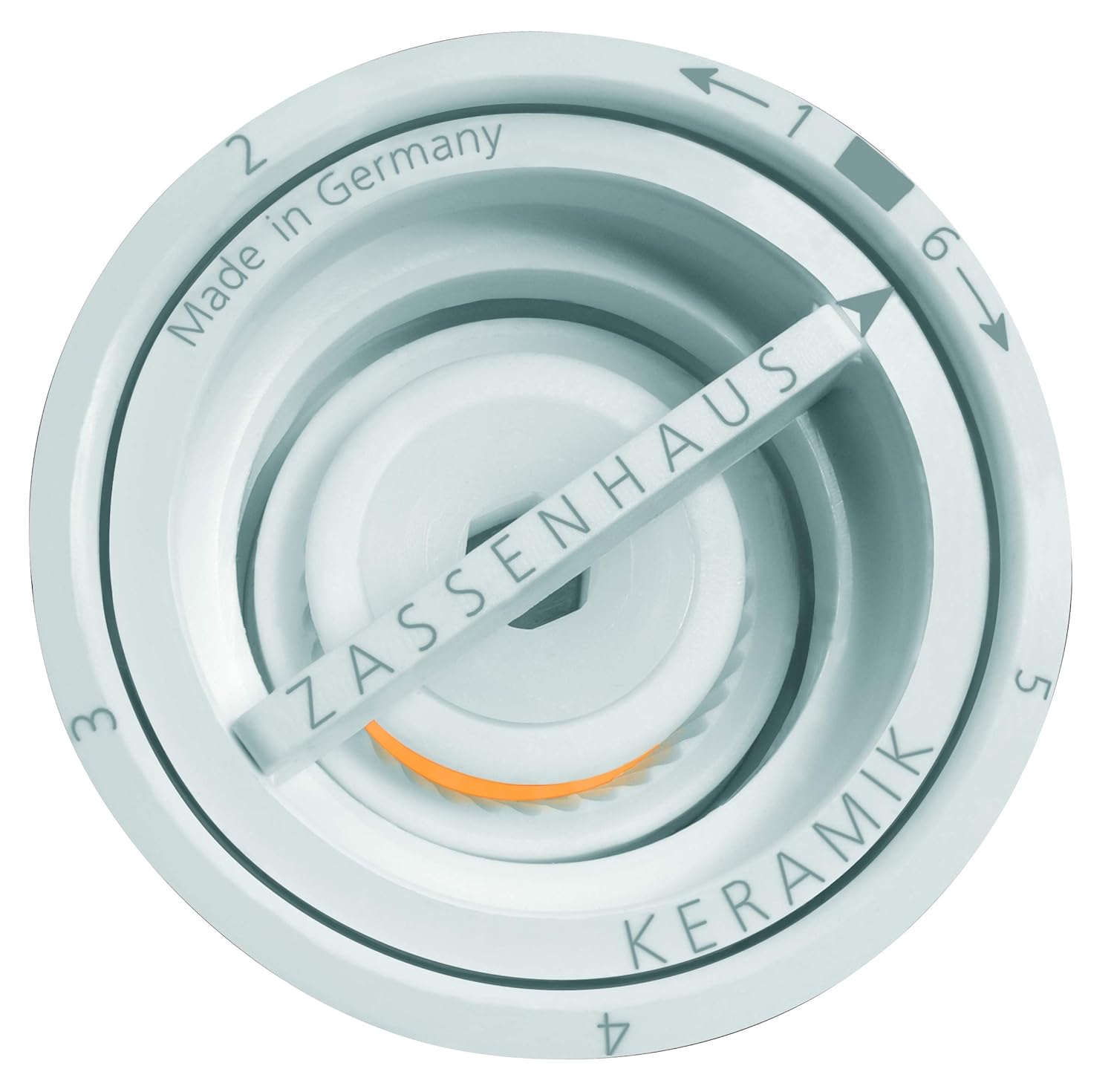 • KERAMIKMAHLWERK – MADE IN GERMANY – Das patentierte Zassenhaus-Mahlwerk ist härter als Stahl und absolut verschleiss- und korrosionsfrei. (Jede Mühle wird auf perfekte Funktionalität geprüft und ist deshalb mit einer kleinen Menge Pfeffer/Salz