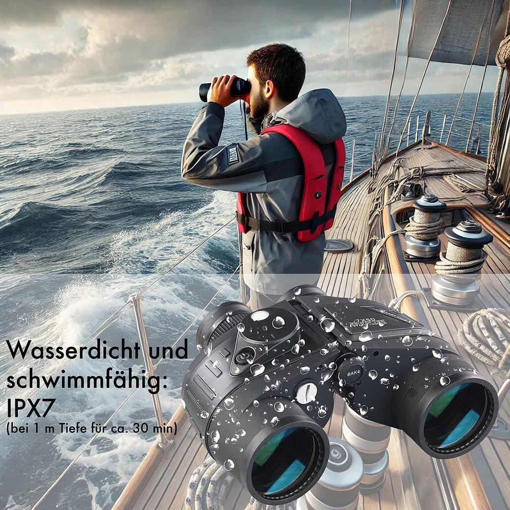 - Wasserdicht und schwimmfähig: IPX7 (bei 1 m Tiefe für ca. 30 min) • Objektivdurchmesser: 50 mm • Austrittspupille: 7,1 mm • Porroprisma • Gewicht: ca. 0,9 kg