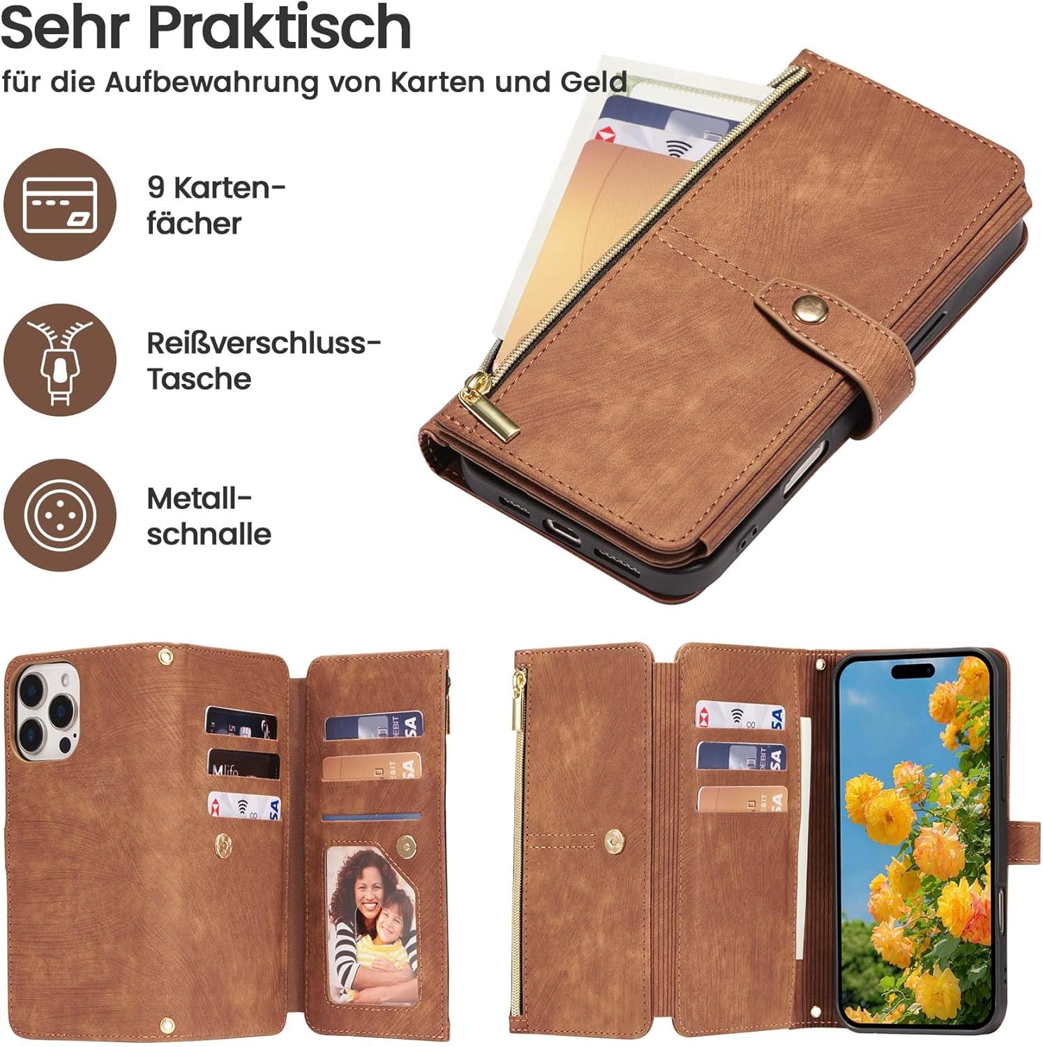 - HANDYPORTMONEE DESIGN: Mit ihre 9 Kartenfächer und Reissverschluss Tasche ist die Handytasche praktischer als andere Hüllen; Sie kann als Geldbörse verwendet werden, und damit tragen Sie Ihre Karten und Ihr Bargeld immer ordentlich und sicher bei sich