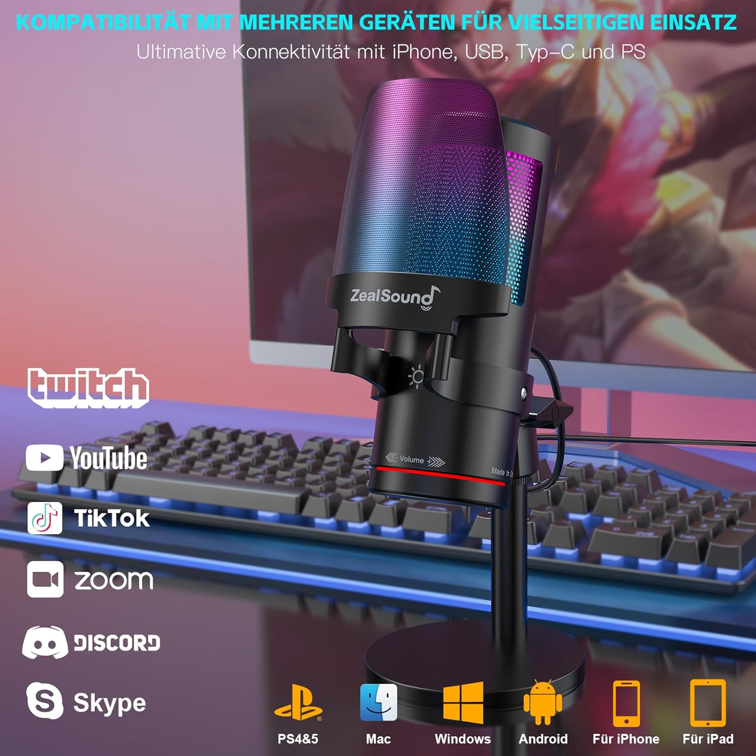 - 【Plug & Play】Das zealsound km8 USB Gaming-Mikrofon ist sofort einsatzbereit und kompatibel mit iPhone, iPads, PCs, Laptops, Handys, Mac, Macbook, ChromesBook, PS5/PS4. Keine Treiber erforderlich! Dieses Podcast-Mikrofon-Kit enthält 2 Adapter, den