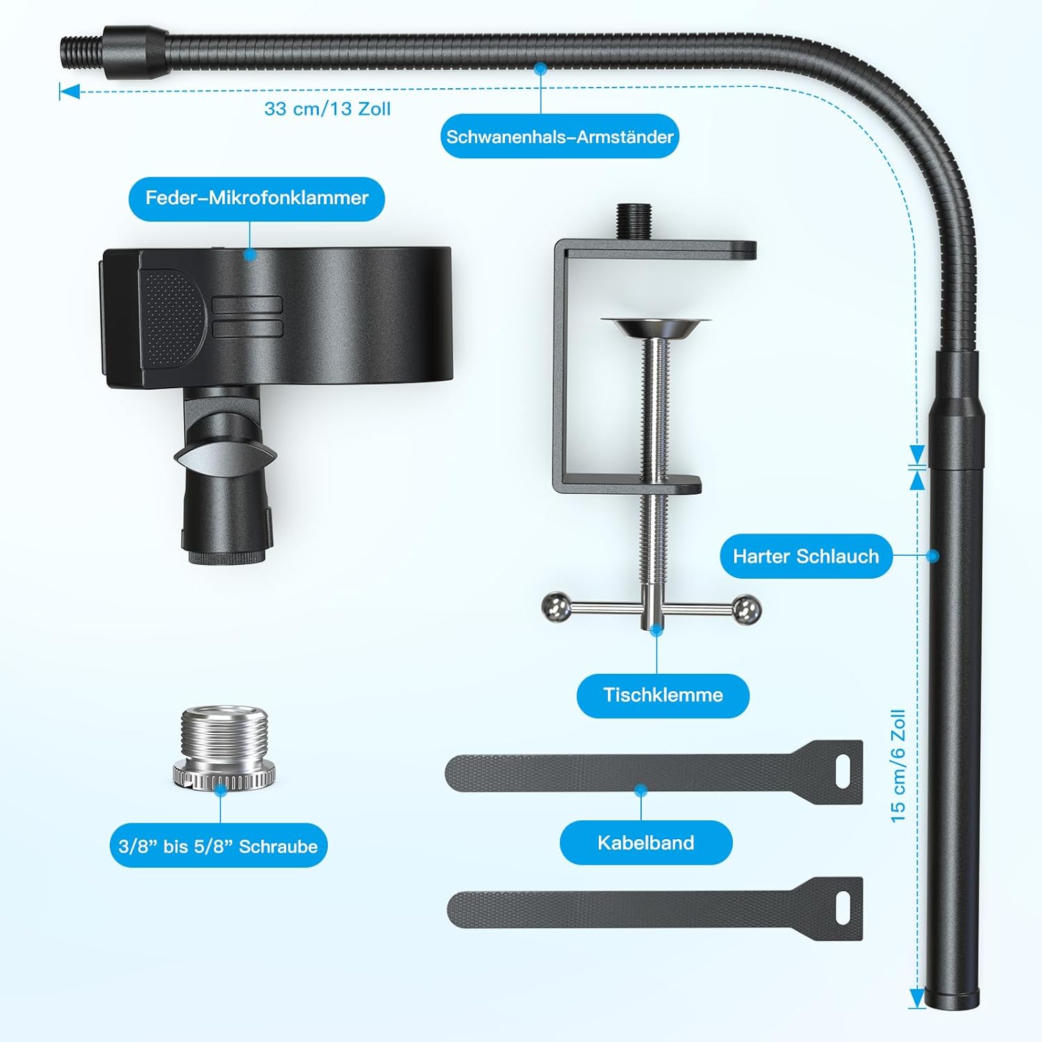 - 【Packungsinhalt】1 x 19-Zoll-Gänsehalsschwanz-Mikrofonarm, konstruiert mit hartem und weichem Schlauch, 1 x Aluminiumlegierung-Metall-Tischklemme, 1 x 3/8" auf 5/8" Metall-Schraubadapter. 1 x Verbesserter Mikrofonclip-Halter für Mikrofone mit